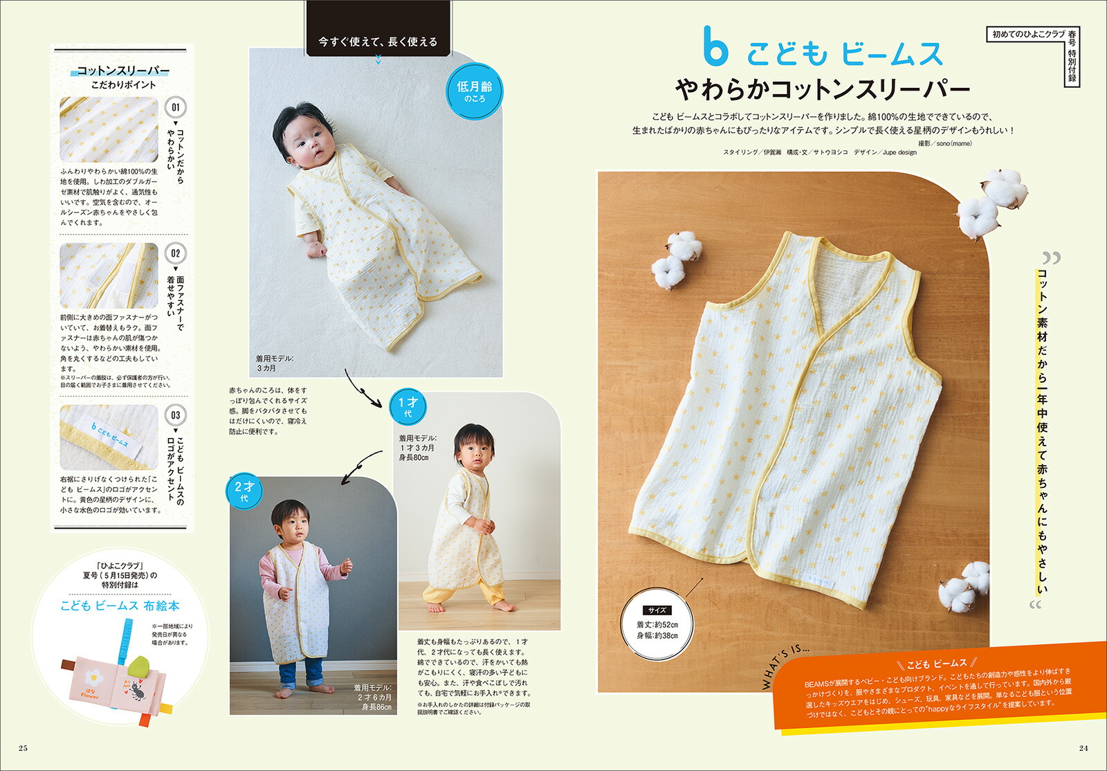 特別付録「こどもビームス やわらかコットンスリーパー」が1冊に1つついています。 また、とじ込みBOOKは「赤ちゃんのお世話 スタートBOOK」。産院退院後から1カ月は、慣れない育児でとても大変な時期。生まれたばかりの赤ちゃんのお世話のしかたが写真や動画でわかります。