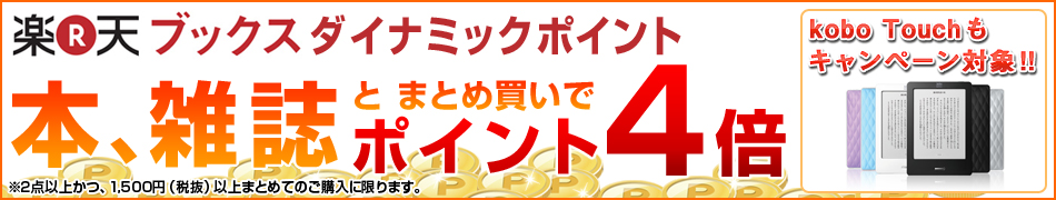 エントリー期間中に以下をすべて満たした楽天会員の方 ‐当キャンペーンページ内の「まとめ買い&複数購入で最大150ポイントプレゼント!ダイナミックポイントキャンペーン」にエントリー完了 ‐楽天ブックス(PC・ケータイ・スマートフォン)で「本」「雑誌」ジャンルの商品を1回のご注文で1,500円(税抜)以上まとめてご購入(ご注文完了) ※受注番号が同一の注文に限ります。 ※エントリーとご注文の順序は問いません。 ※「対象商品」は以下に記載。 ※楽天会員でない方は、エントリーと同時に楽天会員登録(無料)ができます。 キャンペーン対象ご注文を期間中3回以上でさらに100ポイントプレゼント! 【キャンペーン対象の例】 「本」+「本」を1,500円(税抜)分まとめてのご購入= キャンペーン対象!ポイント3倍 「本」+「雑誌」を2,000円(税抜)分まとめてのご購入= キャンペーン対象!ポイント3.5倍 「本」+「雑誌」を2,000円(税抜)分と「DVD」を1,000円(税抜)分まとめてのご購入= キャンペーン対象!ポイント4倍 「本」+「本」を1,600円(税抜)分と「GAME」を4,000円(税抜)分まとめてのご購入= キャンペーン対象!ポイント4倍(特典ポイント150ポイント!) ※「対象商品」2点まとめてのご購入で、1,500円(税抜)を超えた際には、1,500円(税抜)を超えたご注文金額100円(税抜)毎に0.1倍ずつ加算してポイント付与いたします(最大4倍まで) ※ご注文1回あたりの特典ポイント上限は、150ポイントになります。 【キャンペーン対象外となる例】 「本」を1,000円(税抜)分と「GAME」を4,000円(税抜)分まとめてのご購入=「本」「雑誌」ジャンルのご注文金額が1,500円(税抜)に満たないため、キャンペーン対象外 「DVD」+「CD」を4,000円(税抜)分まとめてのご購入=「本」「雑誌」ジャンルのご注文金額が1,500円(税抜)に満たないため、キャンペーン対象外 「本」を2,000円(税抜)分ご購入=ご注文点数が2点に満たないため、キャンペーン対象外 【ご注意ください】 注文決済画面(簡単注文画面 STEP3)で配送方法を選択する際、必ず「ヤマト運輸 宅急便・クロネコメール便(一括発送)」または「コンビニ店頭受取」を選択してください。 ※「ヤマト運輸 宅急便・クロネコメール便(分割発送)」を選択された場合は、キャンペーン対象外となります。 ※「一括発送」にてご注文後、商品発送時に楽天ブックスにて「分割発送」の上、配送となったご注文分はキャンペーン対象となります。 詳細はこちら>> |
