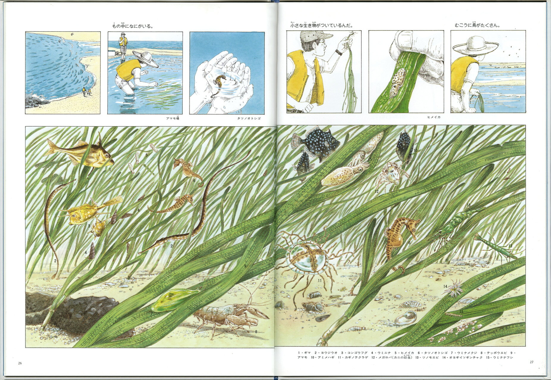 魚貝類や海草、鳥、花など、海辺で観察できる動植物と、キャンプの用意や道具の作り方まで収めた、海へ行くとき必携のガイドブック絵本。