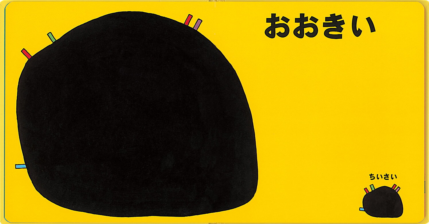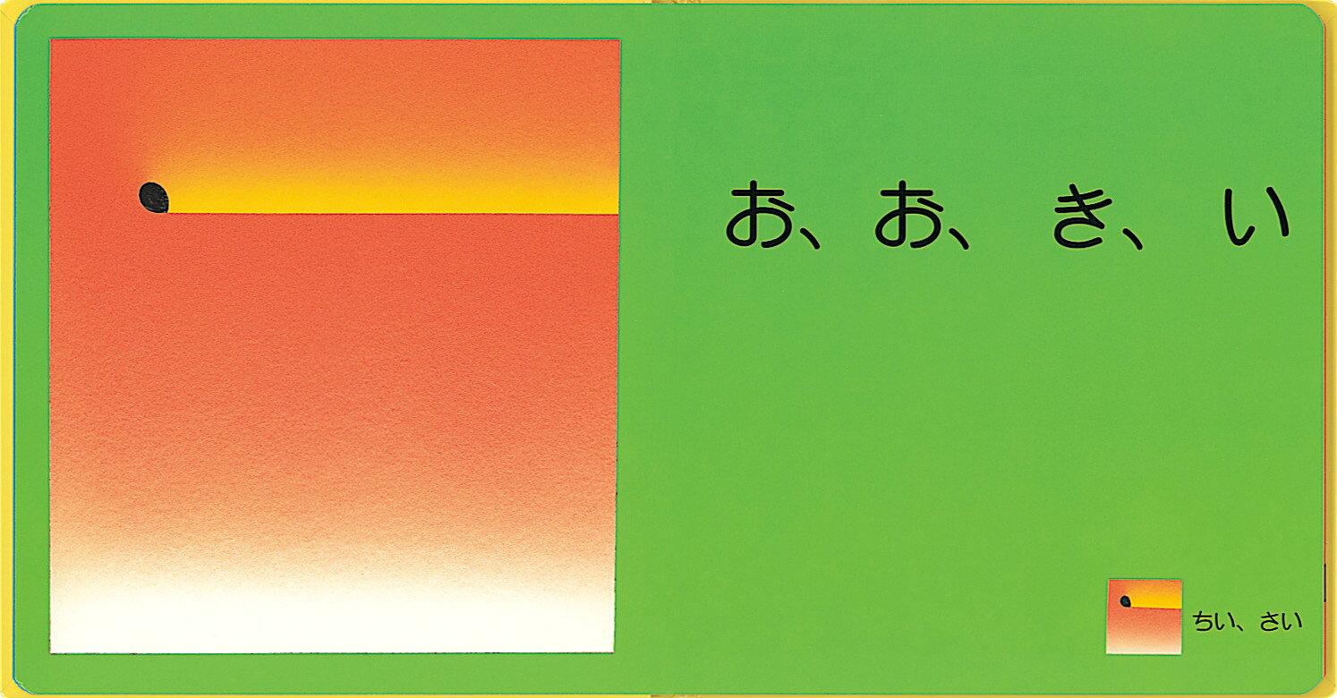 大きい丸と小さい丸、大きな四角と小さな四角。いろいろな形の大小を、抽象画で見せていきます。思いもかけないユニークな形、鮮やかな色彩は、感性豊かな赤ちゃんを魅了することでしょう。言葉は、「おおきい ちいさい」もしくはそのバリエーションのくり返し。男の人の太い声で「おーきい」と読んであげると、赤ちゃんはもっと喜ぶことでしょう。日本のモダンアートの第一人者・元永定正さんならではの、不思議で愉快な絵本です。