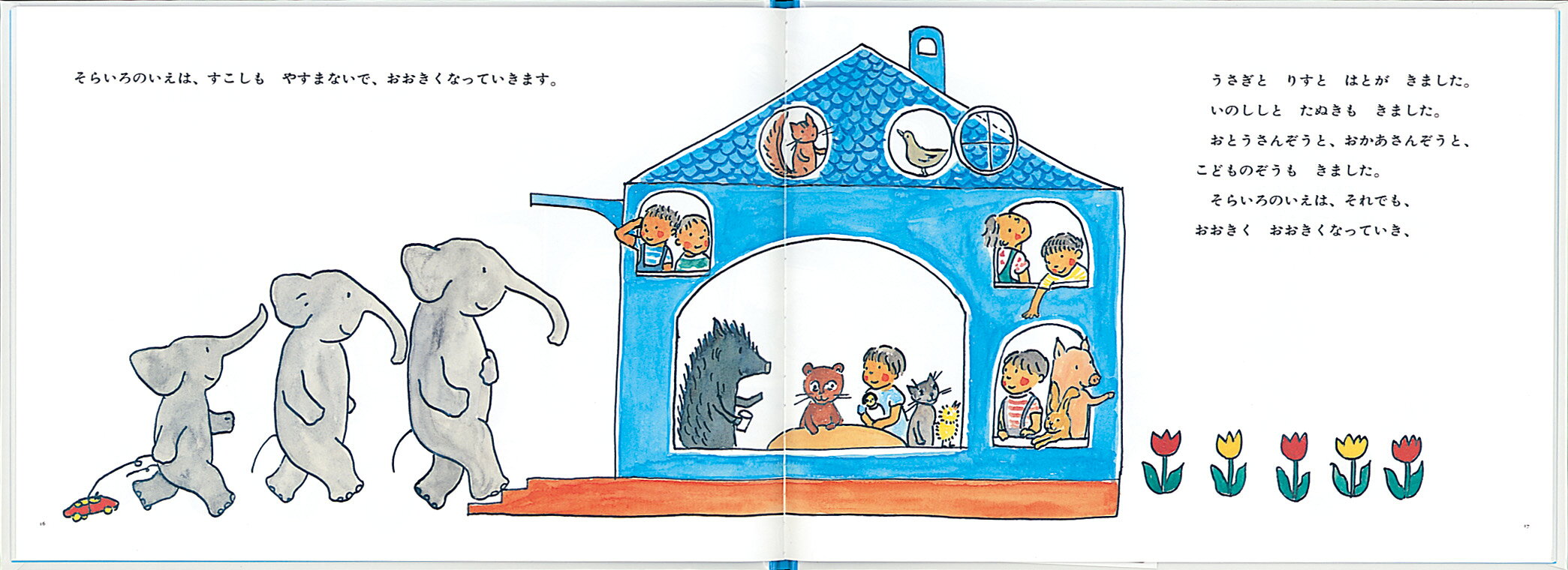 空色の家はみるみるうちに大きくなり、たくさんの動物や鳥や子どもたちの楽しい遊び場になります。