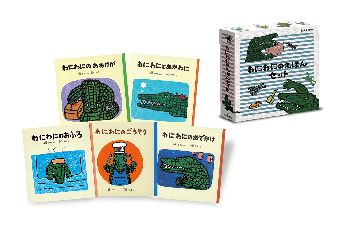 『わにわにのおふろ』『わにわにのごちそう』『わにわにのおでかけ』『わにわにのおおけが』『わにわにとあかわに』を5冊セットでお届けします。