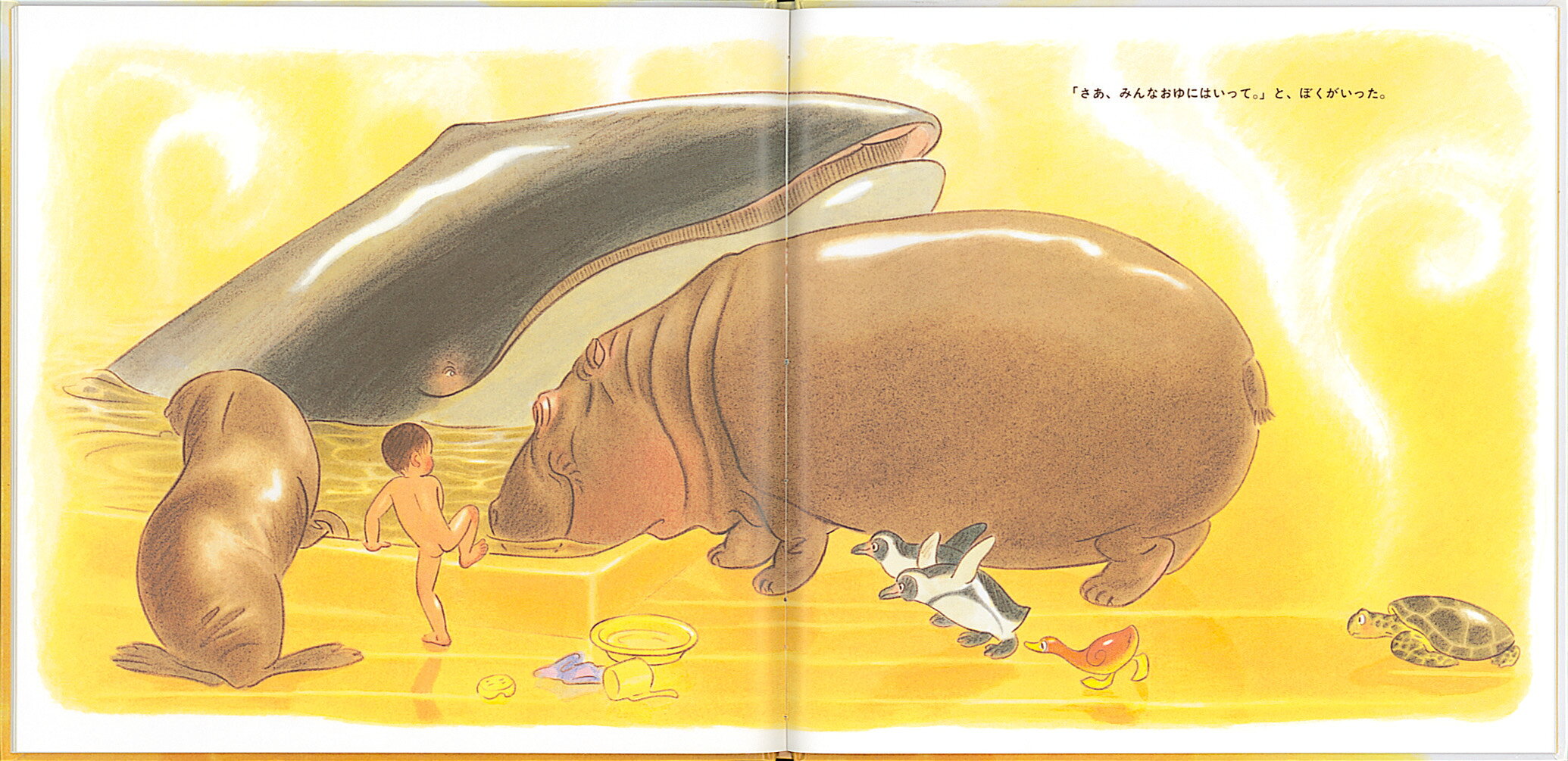 ぼくはおふろが大好き。あひるのプッカをつれてはいると、かめやペンギンなどが登場して…。子どもの空想の世界をのびのびと描いた絵本。