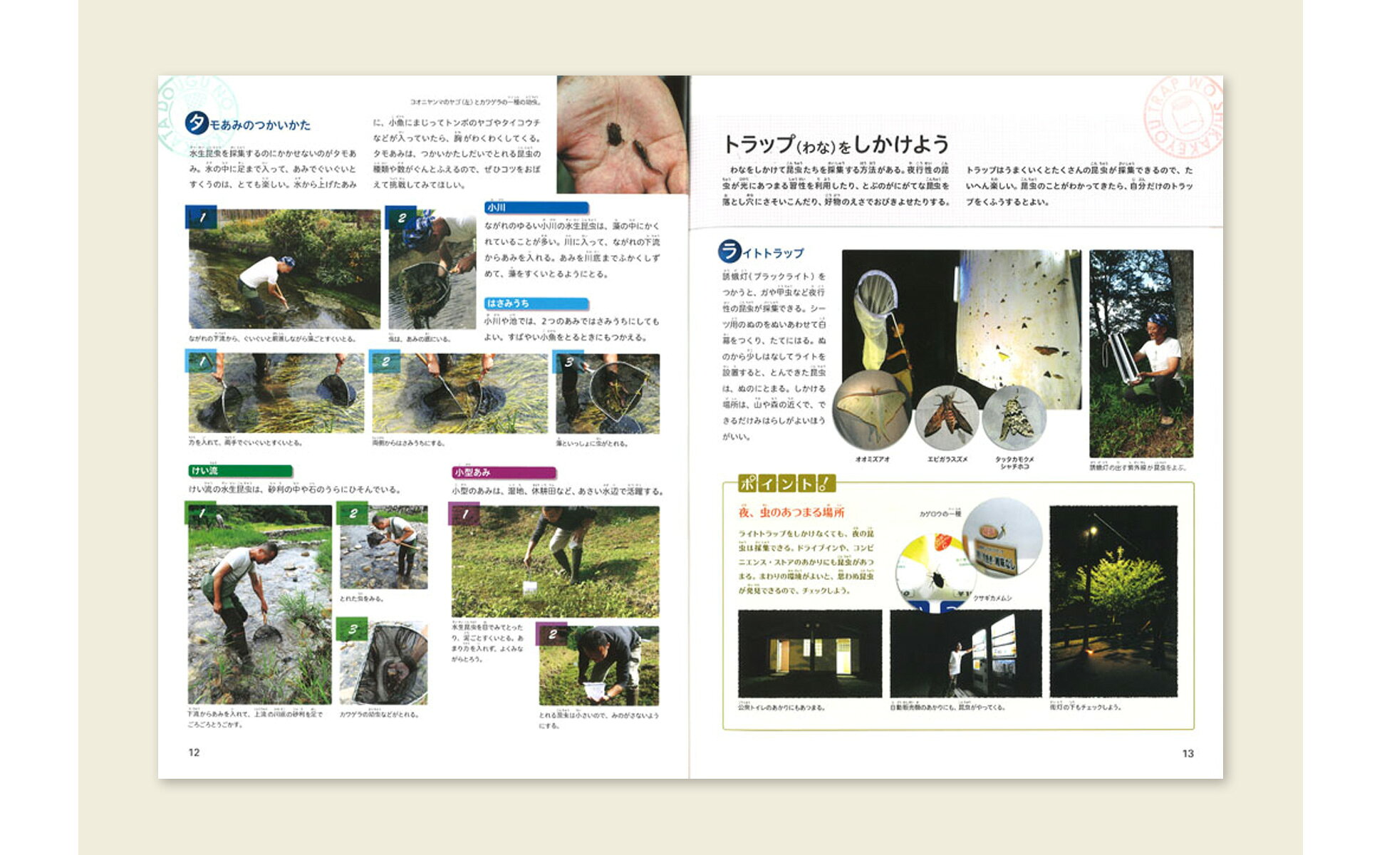 網のふりかたから、ユニークなトラップのしかけかたまで、今森先生が実際に行った写真を、わかりやすく解説しています。