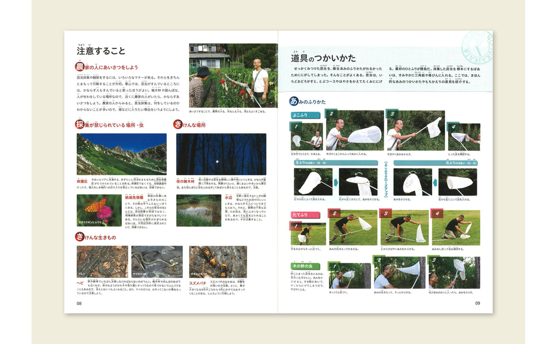 虫の取り方では虫別の網の使い方、コツなどが写真付きで詳しく載っています。標本の作り方も載っていて、とってもわかりやすい!