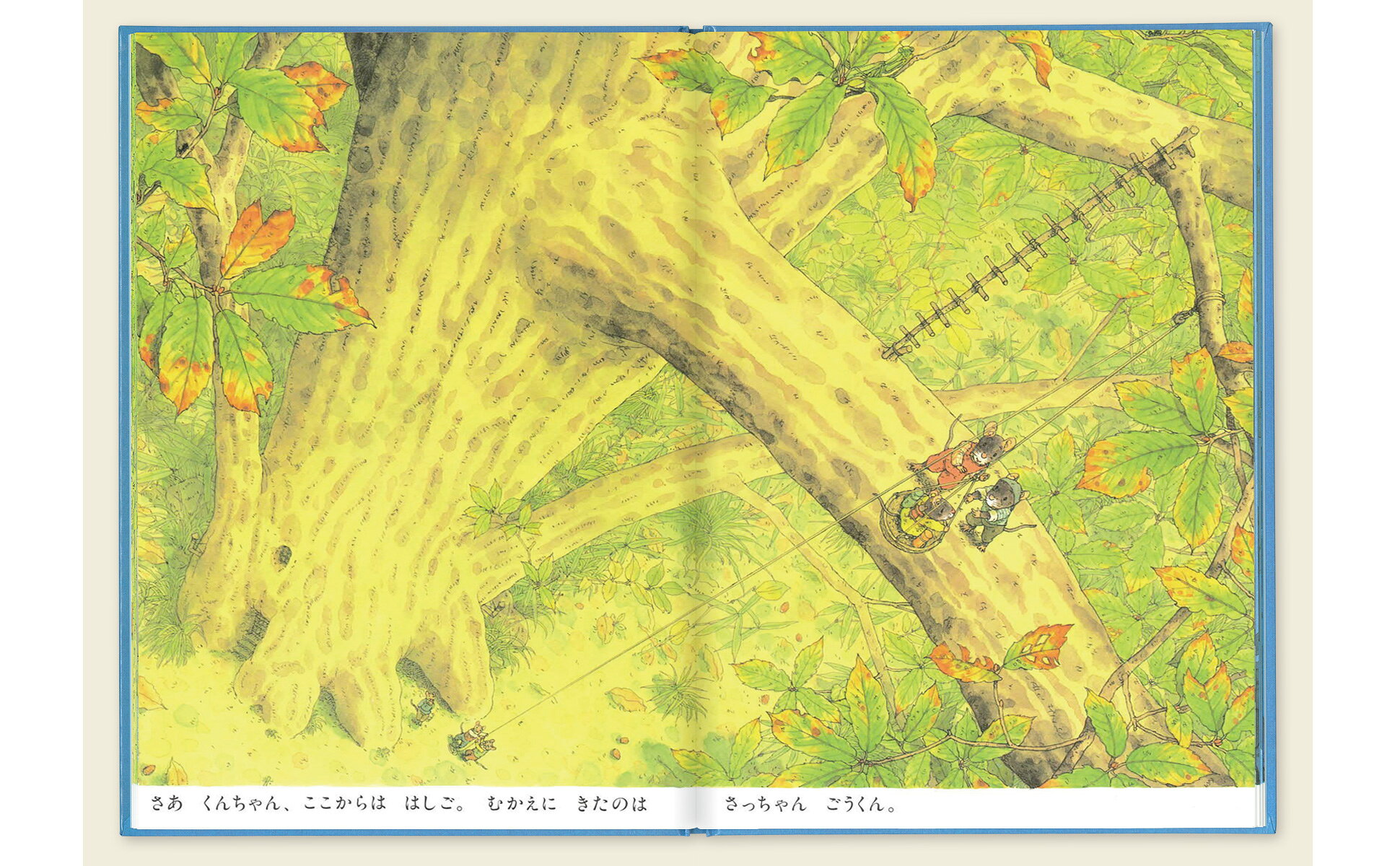 14ひきの子どもたちは、おうちのある大きなクヌギの木の上に登り、何かを作っています。
