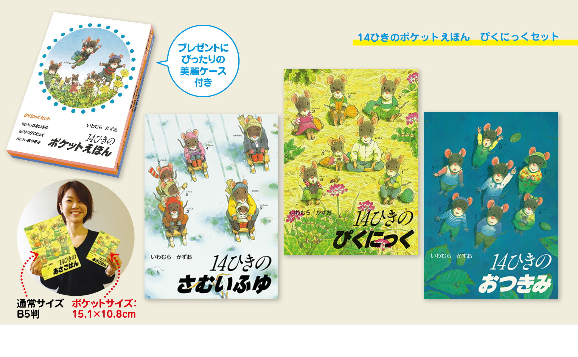 家族といっしょ 自然といっしょ「14ひきのシリーズ」誕生30周年記念出版です。「さむいふゆ」「ぴくにっく」「おつきみ」の3冊セット美麗ケース入り。おでかけに、プレゼントにぴったりのかわいいサイズの「14ひき」をお楽しみください。