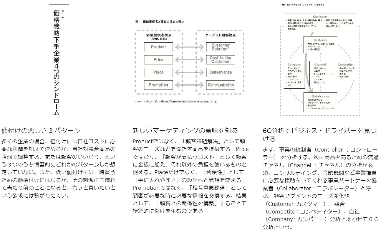 1 マーケティングはお客様へ提供する価値を創造すること(マーケティング上の価格戦略の意義/価格戦略下手企業4つのシンドローム/『顧客価値創造プライシング』とは何か?)/2 現状を知りマーケティング上の課題を見つけなさい(新しいマーケティングの意味を知る/顧客にとってコストはPain(痛み)。「痛い!」と感じさせない/SWOT分析をしてマーケティング上の課題を抽出する)/3 顧客価値創造プライシングを最適化しなさい(狙うべき良い顧客は誰か決める/ブランド独自のポジションを見つけるーPositioning,Branding/顧客に提供する価値の創造をする(Customer Solution)/価値を伝達する(Communivation,Convenience)/顧客価値創造プライシングを実行する(Cost of the Customer)/価格戦争に向けて想定し得る対策/B2B事業における価格戦略)/4 顧客価値創造プライシングを組織化する(体系的な分析手法を組織化する/価格戦略の責任部署をつくり実行する/トップがコミット(責任を持つ約束)する)