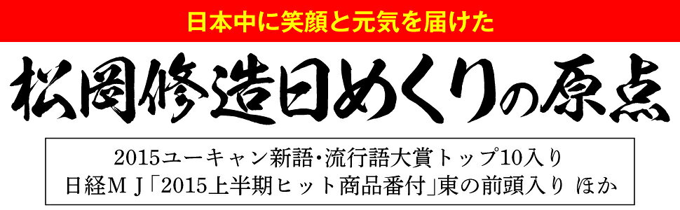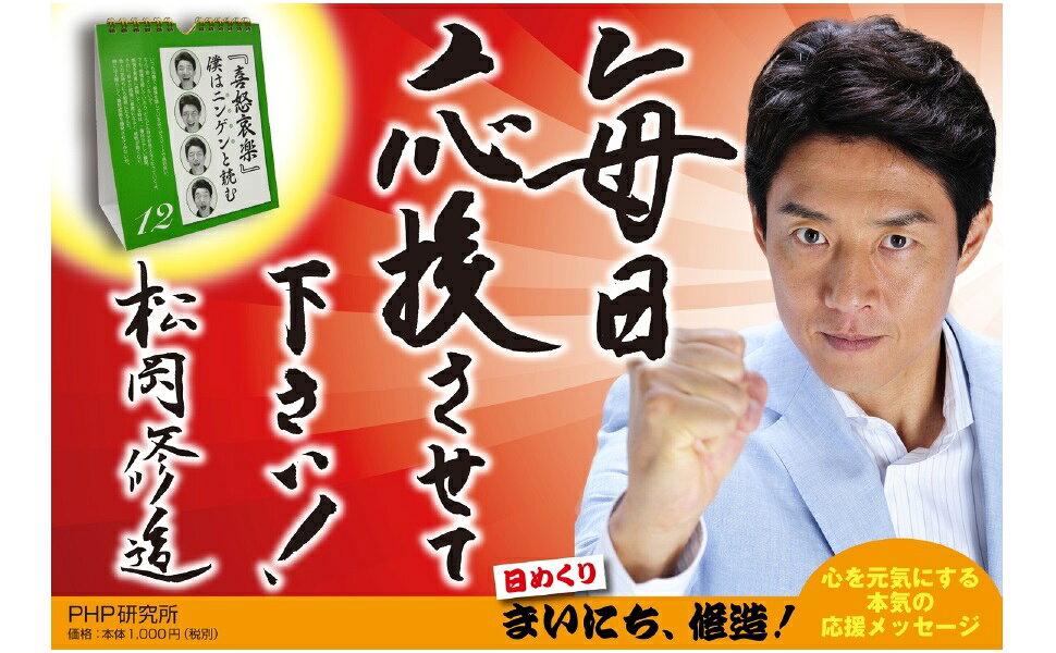 元気が出ない? 本気になれない? それなら僕に、あなたの毎日を応援させてください!!▼PHP日めくりに、日本の応援団長・松岡修造氏が登場! 公式ホームページから発信される話題の“修造語録”に、書き下ろしの新作をプラスした著者初の日めくり。31の熱い言葉と4つのスペシャルメッセージ、さらに本作のために撮り下ろした、著者ならではのユニークな写真を通じて、すべての日本人の毎日に元気と笑顔を届けます。▼「今日から君は噴水だ!」「自分を持ちたいなら、サバになれ!」▼朝、出掛ける前に眺めれば、その日を明るく前向きにしてくれる。帰宅後に眺めれば、疲れを吹き飛ばし、明日を元気に生きるための力をくれる。日々頑張る人はもちろん、心が折れそうになっている人、次の一歩を踏み出す勇気がほしい人を、松岡修造がありったけの本気の言葉で応援します。何かに頑張っている人へのプレゼントにも最適です。