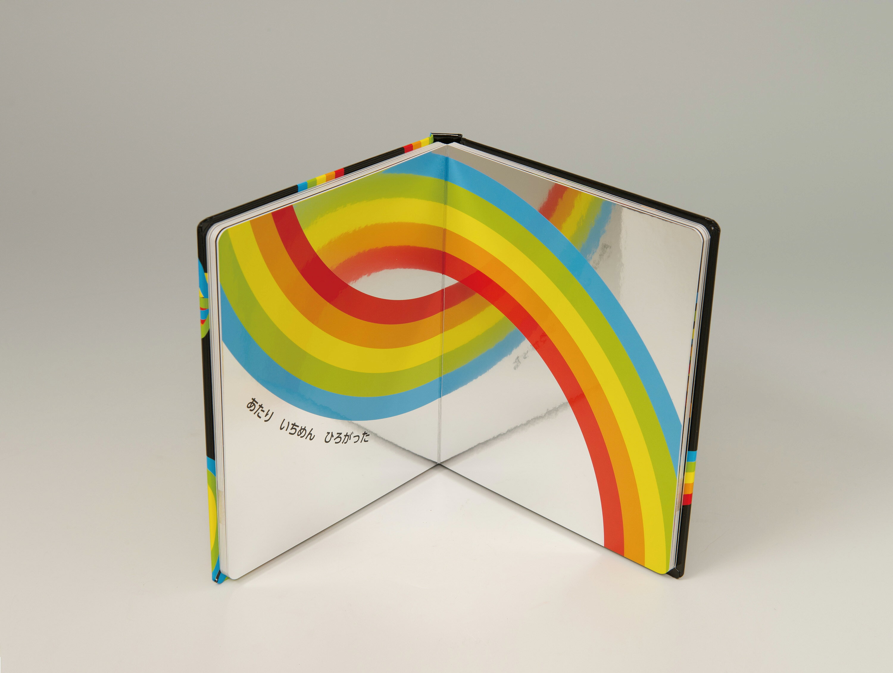 鏡のように反射するピカピカの紙でつくられた絵本です。絵本を開くと、両側のページの絵が互いに映りこみ、驚くほど立体的に見えます。ともかく百聞は一見に如かず。ぜひページを開いてみて下さい。ページとページの間に浮かび上がるふしぎなにじの美しさを味わいながら、未だかつてない新鮮な視覚体験をお楽しみください。