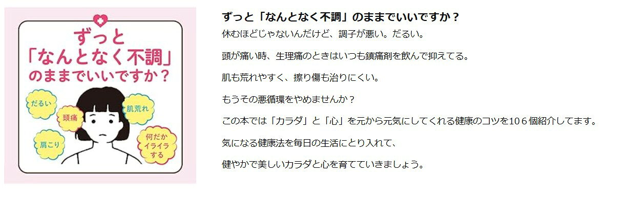 | 商品説明 | その不調、このまま放っておいて大丈夫? 本来のカラダの力をとりもどす今すぐできる健康のコツ | ちょっと変えるだけでかなりラクになる。毎日の立ち方、歩き方、座り方…など。 |