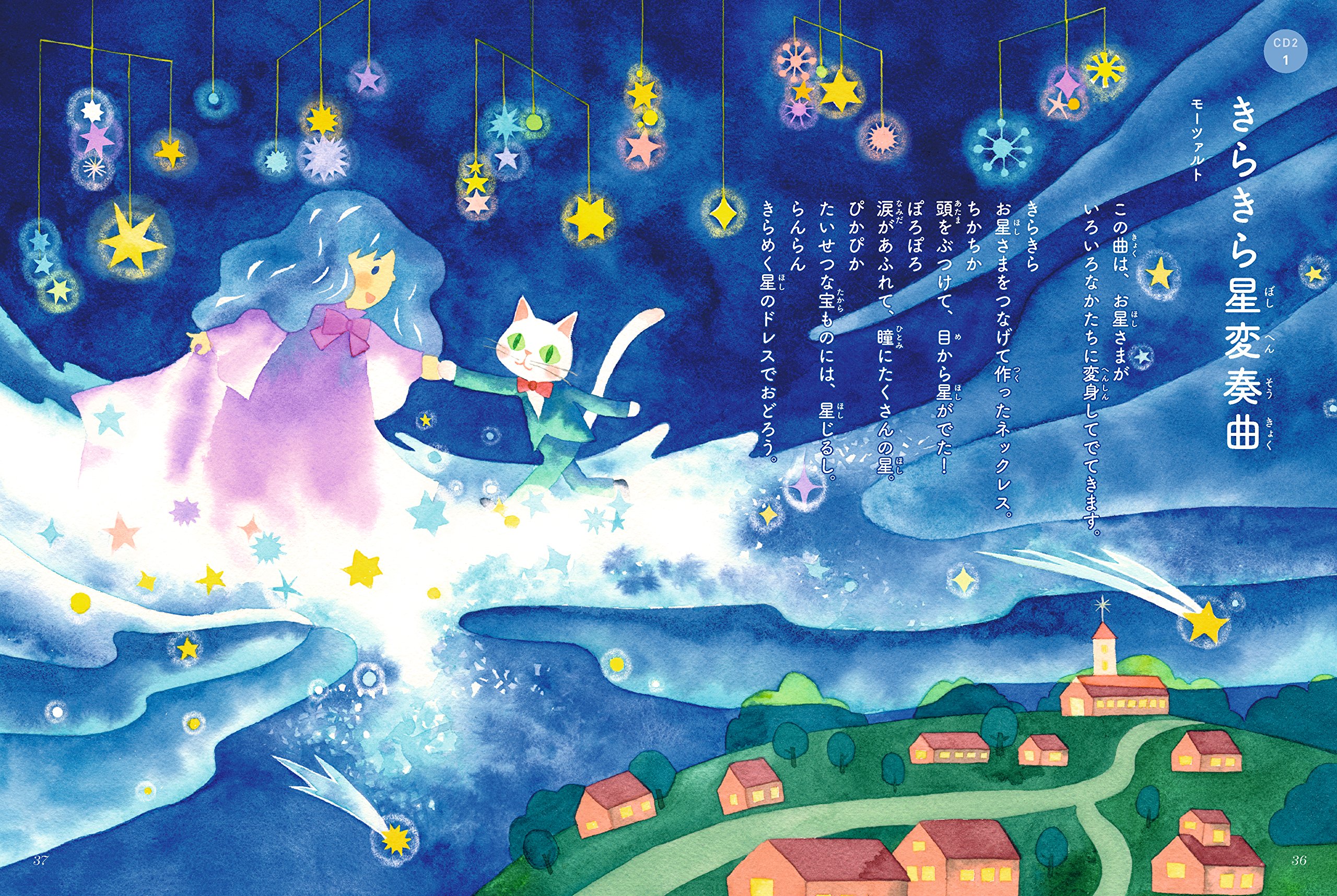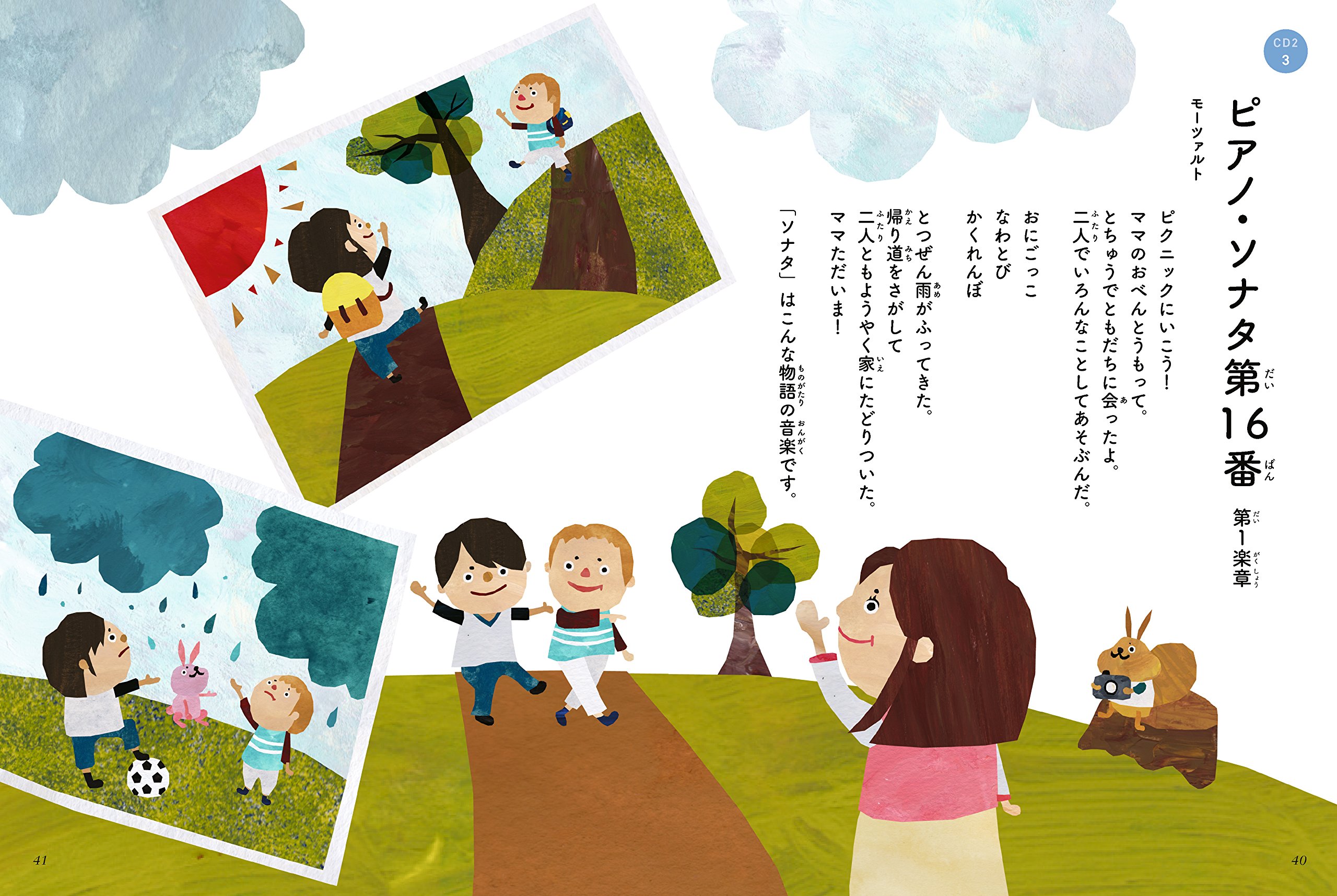 絵本ページでは、その曲の世界観をやさしい文章と素敵なカラーイラストで解説しています。よい音楽は、子どもの心と脳を育みます。帯には脳科学者の茂木健一郎さんの推薦つき!