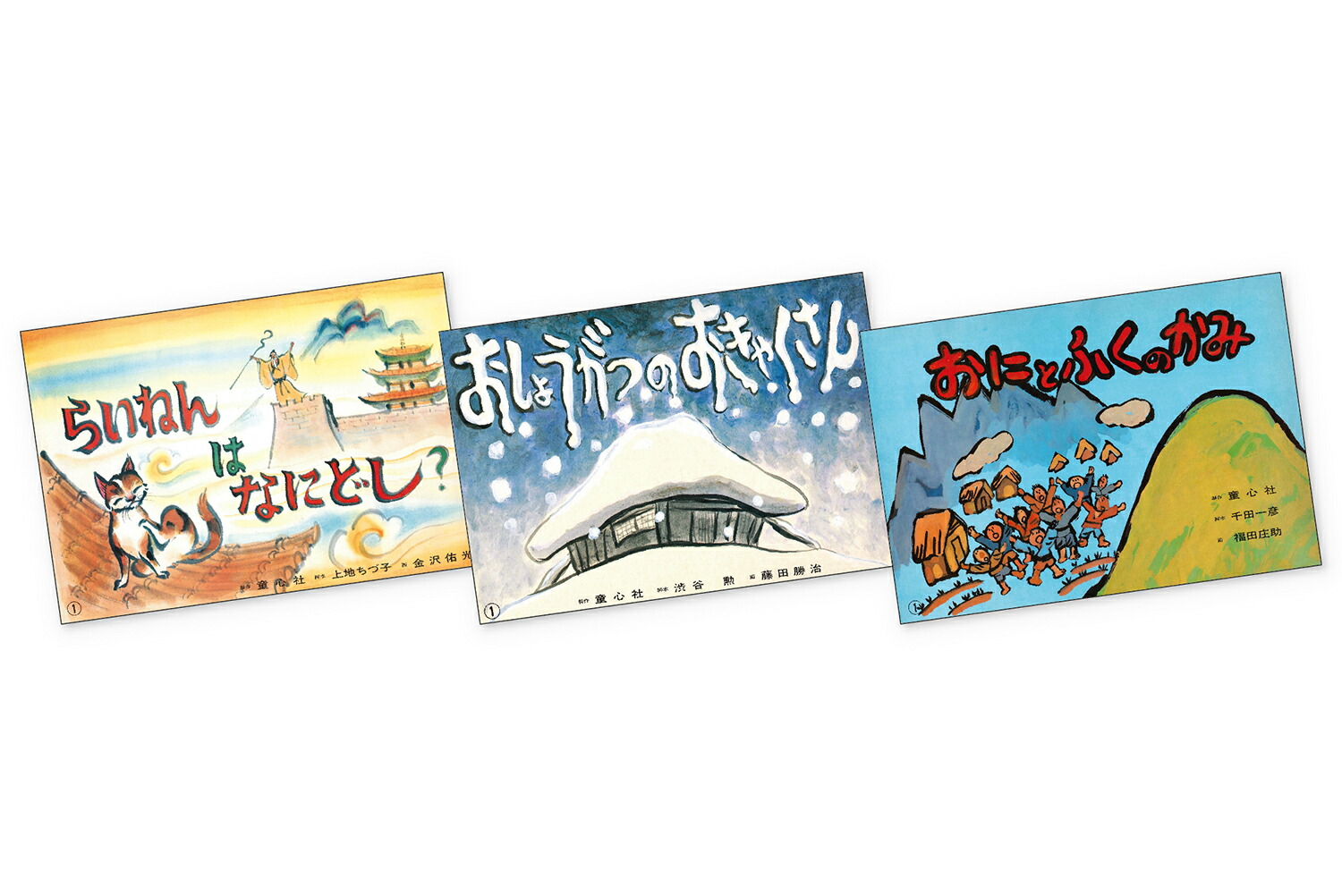 『らいねんは なにどし?』(12場面)干支の順番を決めるために、12ひきの動物が競争です。おやおやハプニングの連続。さて順番は?『おしょうがつのおきゃくさん』(12場面) ゆきふる夜、びんぼうなじさまとばさまの家に、7人の旅人がきました。こころよくむかえると……。『おにとふくのかみ』(12場面) 北山のおにがらんぼうするので、村人は春山のふくのかみに相談。おにを退治しようとするが……。
