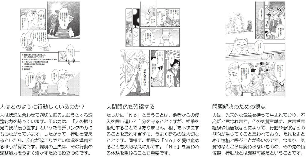 Prologue 認知行動療法って?(ウチの猫がしゃべった!?/認知行動療法とは ほか)/1 自分の気持ちや考えを整理する(モヤモヤとランチの問題について/自分を整理、観察する ほか)/2 考え方のクセをつかんで新しい考えを手に入れる(心のバランスを見直そう/考え方のクセとは ほか)/3 「いつもと違う行動」で世界を広げてみる(「できない」って言ってみたら…/人はどのように行動しているのか? ほか)/4 問題解決に取り組む(消えた「期待」と「モヤモヤ」/問題解決のための視点 ほか)