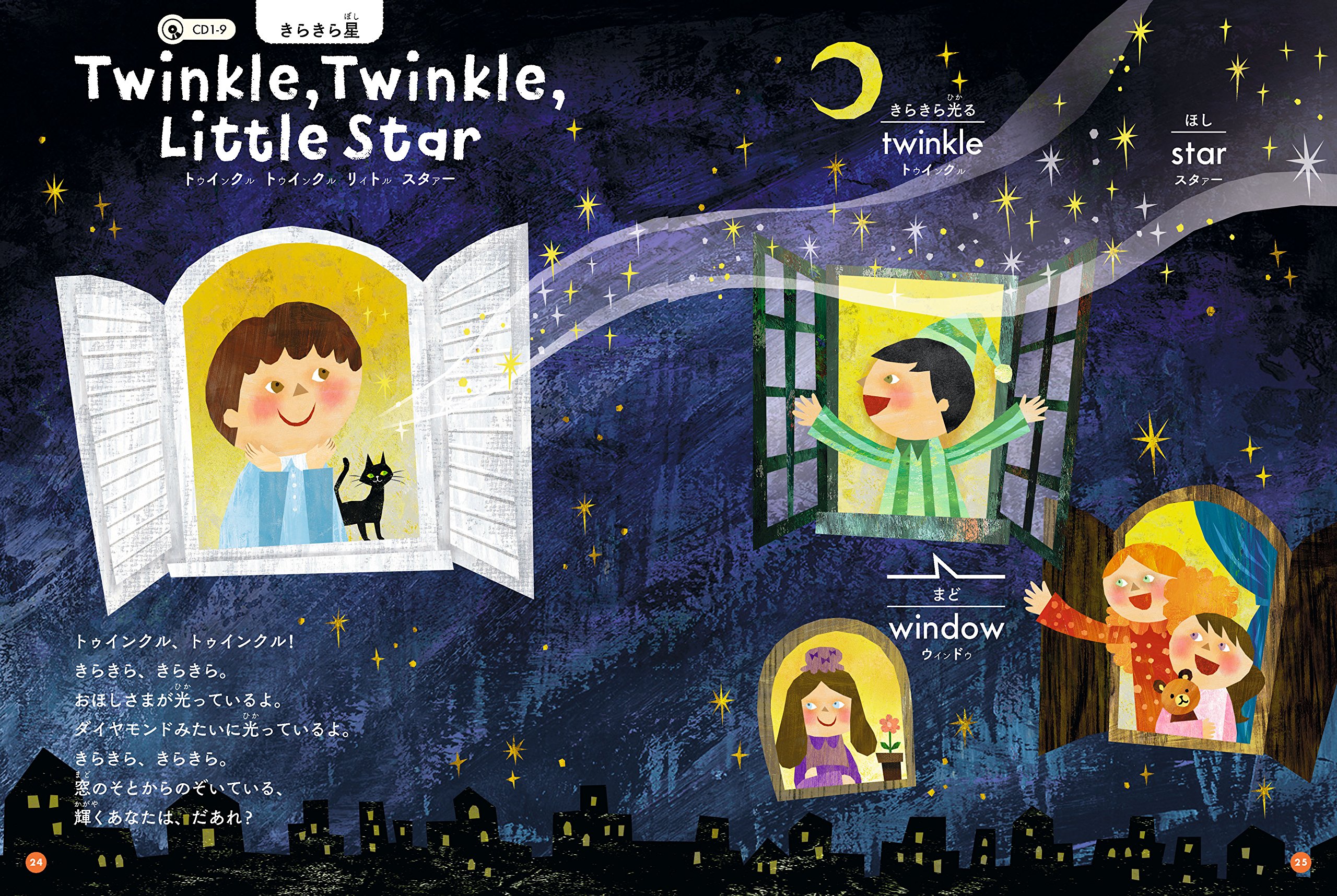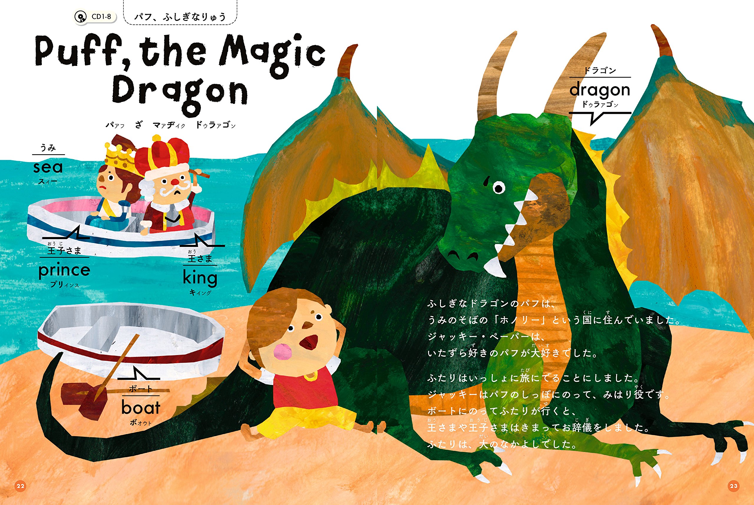 楽しい英語の歌(ミュージカルの有名曲や海外の童謡など)を45曲収録したCD2枚がついた子ども向けの絵本。