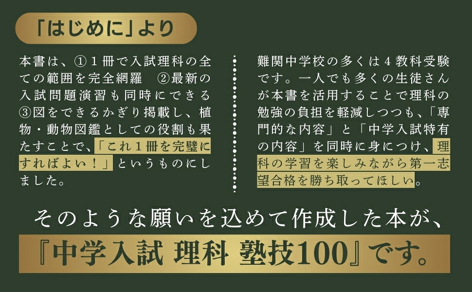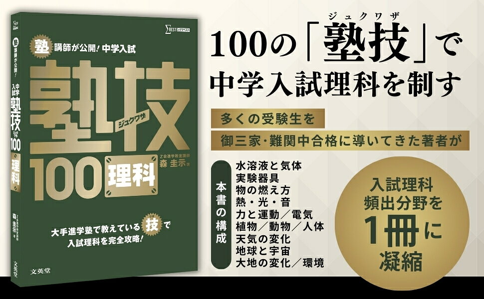 入試理科頻出分野を100の「塾技」に分けてまとめました。中学入試の理科で合格点をとるための力を無理なく身につけることができます。