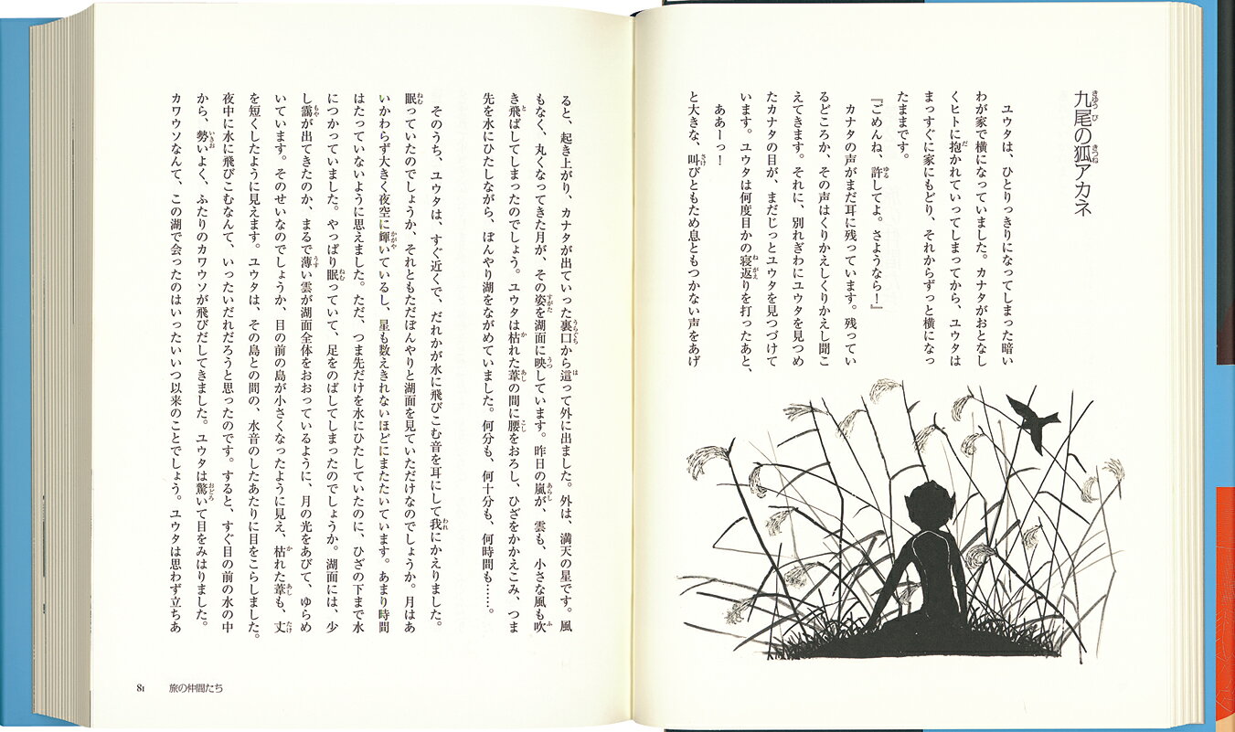 北国の湖に棲む河童のユウタは、早春のある夕暮れ時、九尾の狐を母にもつというキツネに呼び止められます。「そなたは旅立たねばならぬのです」。その言葉に戸惑いながら、やがてキツネの言う“龍川”の水源をめざし、理由も目的もわからぬまま、ユウタは旅の仲間となるキツネの娘アカネと天狗のハヤテとともに旅立ちます。3にんの旅立ちを喜ぶ鳥や獣たちがいる一方で、執拗にあとを追うカラスの群れや謎の黒い影も……。