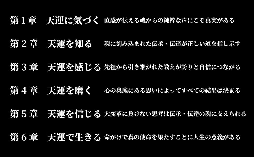 天運の法則 序/第1章 天運に気づくー直感が伝える魂からの純粋な声にこそ真実がある/第2章 天運を知るー魂に刻み込まれた伝承・伝達が正しい道を指し示す/第3章 天運を感じるー先祖から引き継がれた教えが誇りと自信につながる/第4章 天運を磨くー心の奥底にある思いによってすべての結果は決まる/第5章 天運を信じるー大変革に負けない思考は伝承・伝達の魂に支えられる/第6章 天運で生きるー命がけで真の使命を果たすことに人生の意義がある/補章 天運を強化する瞑想