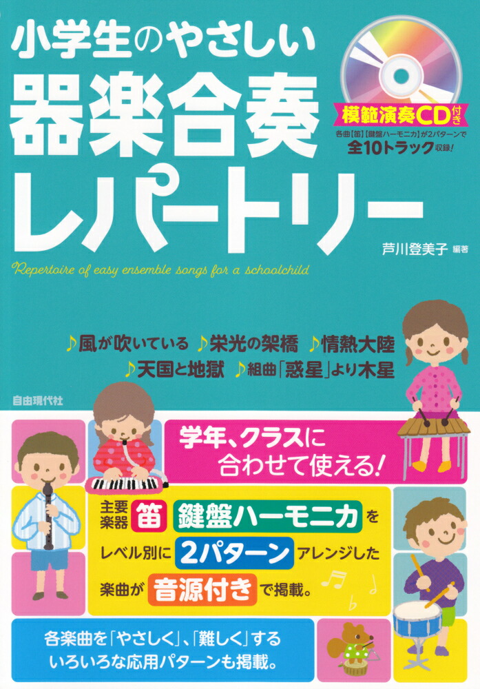 学年、クラスに合わせて使える!主要楽器:笛、鍵盤ハーモニカをレベル別に2パターンアレンジした楽曲が音源付きで掲載。各楽曲を「やさしく」、「難しく」するいろいろな応用パターンも掲載。