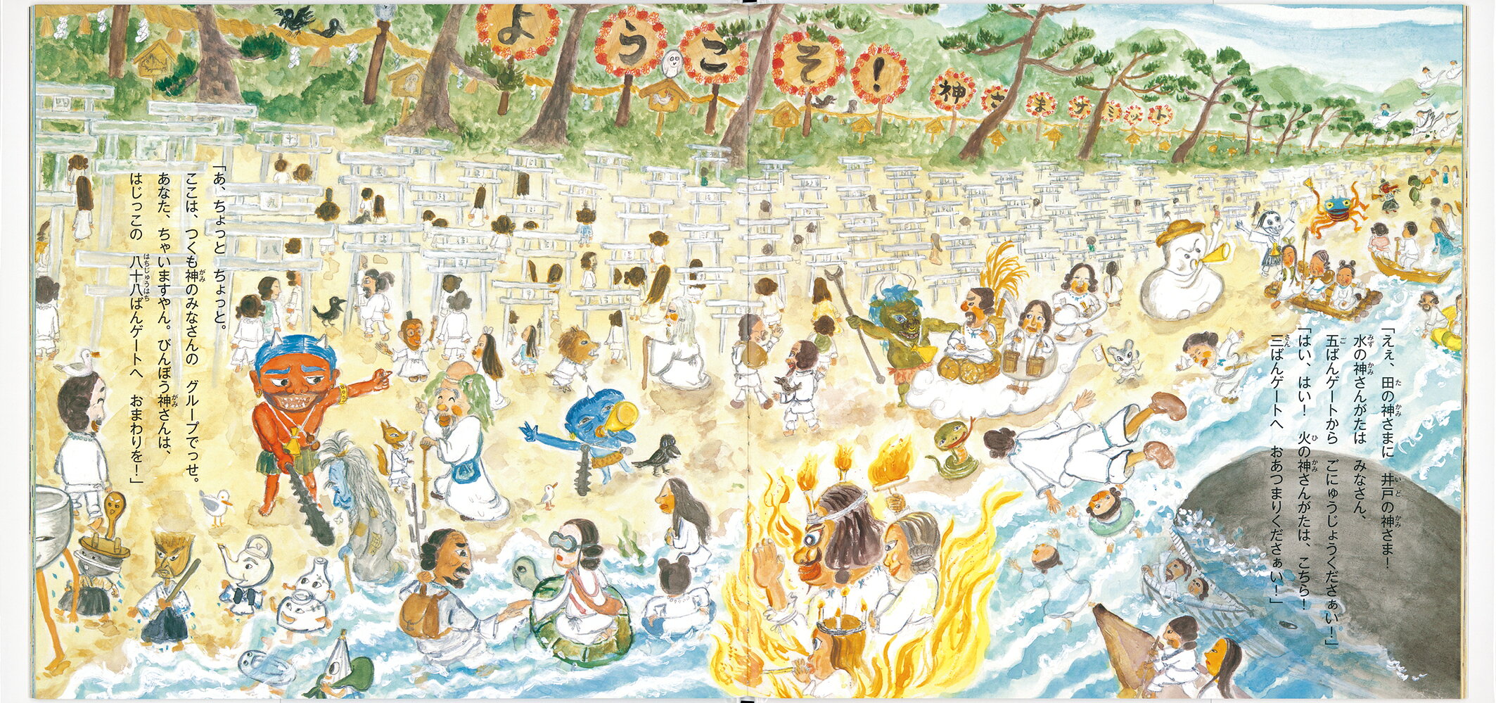 出雲の玄関口、稲佐の浜に来てみれば、日本じゅうからやってくる神さまたちで大混乱。ふたりは案内やら警備やらに大車輪の働きをして、へとへとになってしまいます。ようやくほっと一息ついたところへ怪しい侵入者発見、これは放っておけないと“職務質問”をこころみますが……。