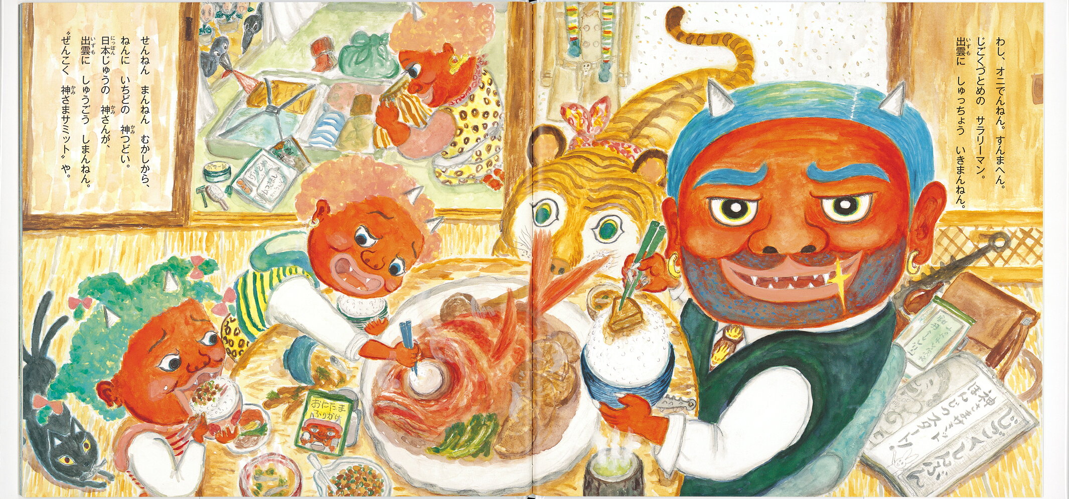 地獄勤めの赤鬼オニガワラ・ケンと同僚のオニジマは、えんまさまから出雲出張を命じられ、「ぜんこく神さまサミット」の会場警備を手伝うことになりました。飛行船に乗りこんで出雲へ向かい、稲佐の浜に来てみれば、日本じゅうからやってくる神さまたちで大混乱。ふたりは案内やら警備やらあっちこっちてんやわんやしながら、神さまたちをお迎えします。開会を告げる神つどいの迎え太鼓が鳴り響き、出雲の夜はふけていきます。