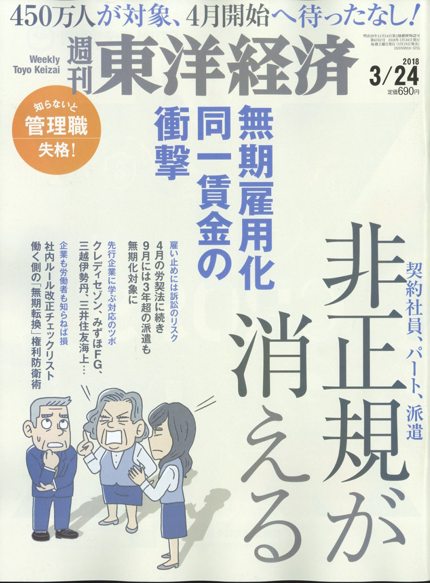 今年、契約社員・パート・派遣の雇用ルールが一変する。4月開始の「無期転換ルール」の対象者は450万人。有期雇用で5年を超えて契約更新する人が希望すれば、無期雇用に転換しなければならない。経営者、管理職層は必読の特集。【第1特集】無期雇用化、同一賃金の衝撃 非正規が消える第1章 真相編 「無期転換ルール」の衝撃2018年から始まる「3つのショック」マンガ3分でわかる「無期転換ルール」[衝撃1] 無期転換ルール開始 雇い止めでトラブルも経営者、人事担当者必読 イチからわかる無期転換Q&A先行企業に学ぶ対策と課題 「有期社員」はこう変わる(1 正社員に積極登用)(2 無期雇用に転換)(3 期限前に一律雇い止め)[衝撃2] 派遣制度が抜本転換「 最低でも2割」の料金上昇[衝撃3] 同一労働同一賃金 揺らぐ正社員の既得権第2章 実践編 今すぐ始める無期対策これだけは押さえたい 実務対応のチェックポイント個人請負は無権利状態無期雇用化で動きだすか 解雇の「金銭解決ルール」労働者必読 ケーススタディ 「無期転換」権利防衛術人事部長覆面座談会│「現場とは激しく衝突、正直不安は残る」非正規労働者の処遇改善は時代の要請だ INTERVIEW│石田 徹●日本商工会議所専務理事/加藤勝信●厚生労働相/神津里季生●連合会長産業リポート発泡酒、新ジャンルに逆風 税改正でビール業界総力戦産業リポート急成長後の新たな難題 リクルートの講義動画(スタディサプリ)特別対談元駐中国大使 宮本雄二×富士通総研 柯 隆 中国全人代で見えてきた 権力集中急ぐ習近平の焦燥ニュース深掘り森友改ざんで安倍1強に風穴ソフトバンク社債に潜むリスクポーラ 古参役員が突然の反旗株 オープンハウス「東京に、家を持とう。」で躍進対話攻勢に出た北朝鮮 非核化の道筋はつくか