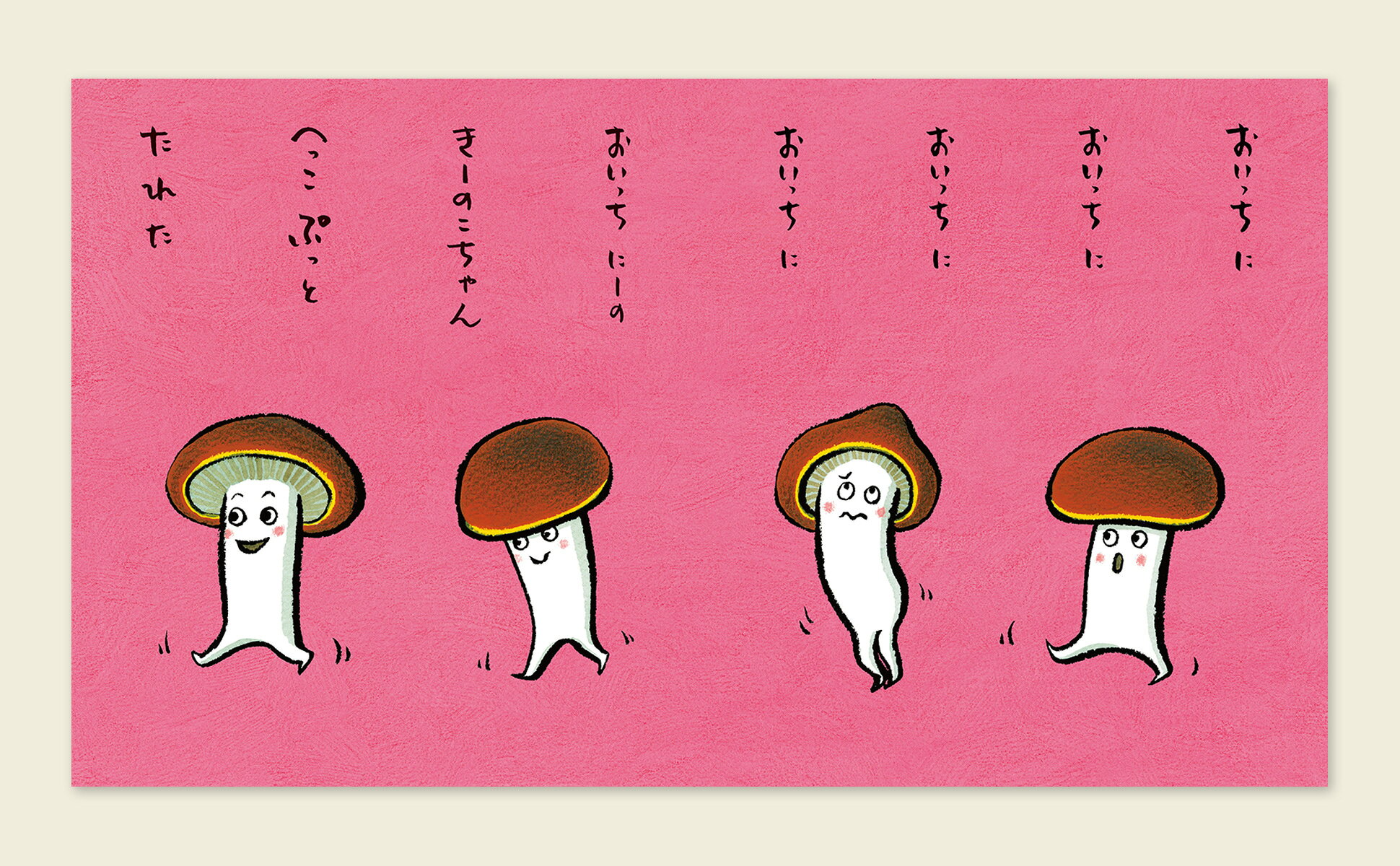 おいっちに…と歩いているのは、きのこやだるま。ぷっ!と、へっこ(おなら)たれたの、だあれ?