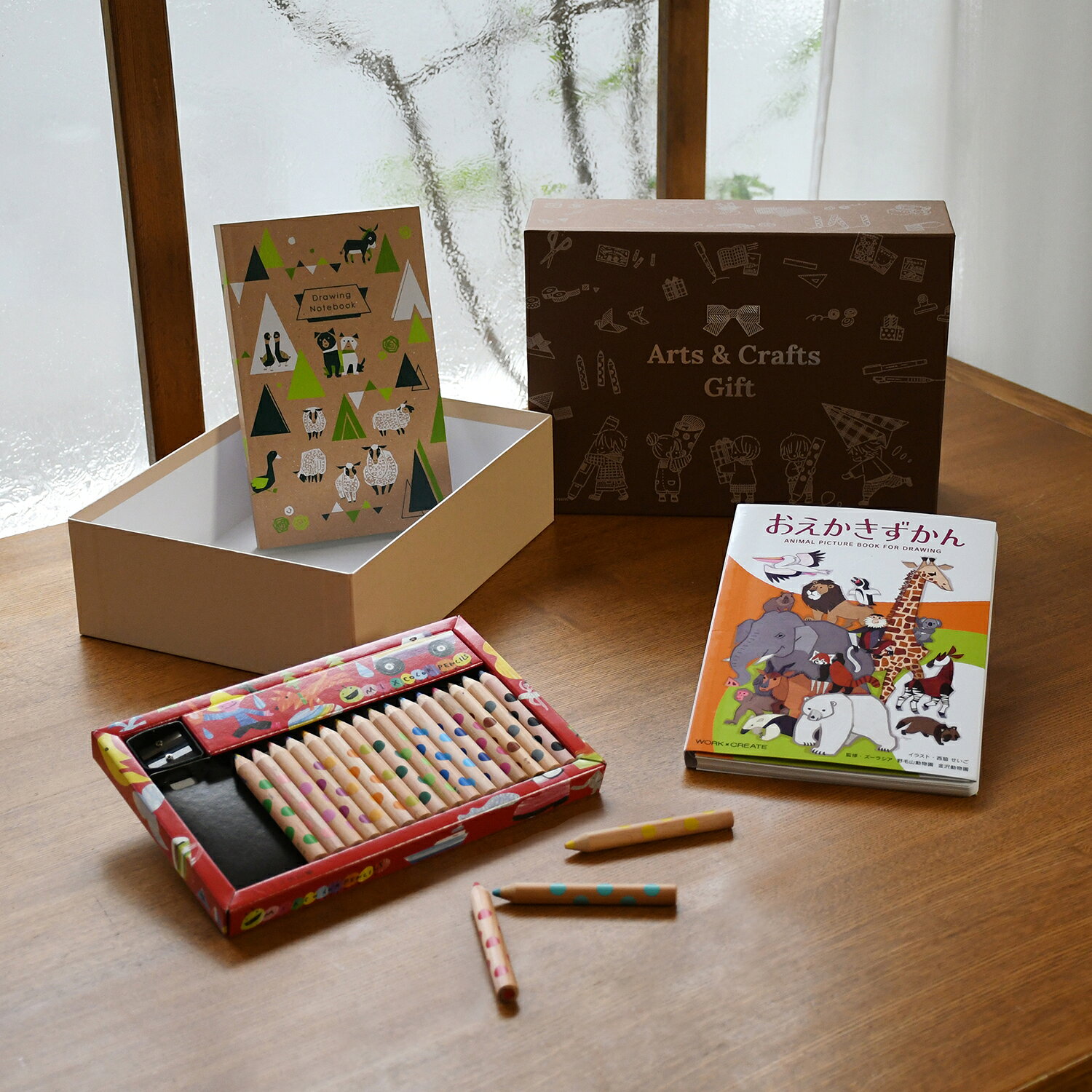 「おえかきずかん」と相性の良い画材「ミックス色鉛筆」をセットにしたギフトボックスもラインアップ。