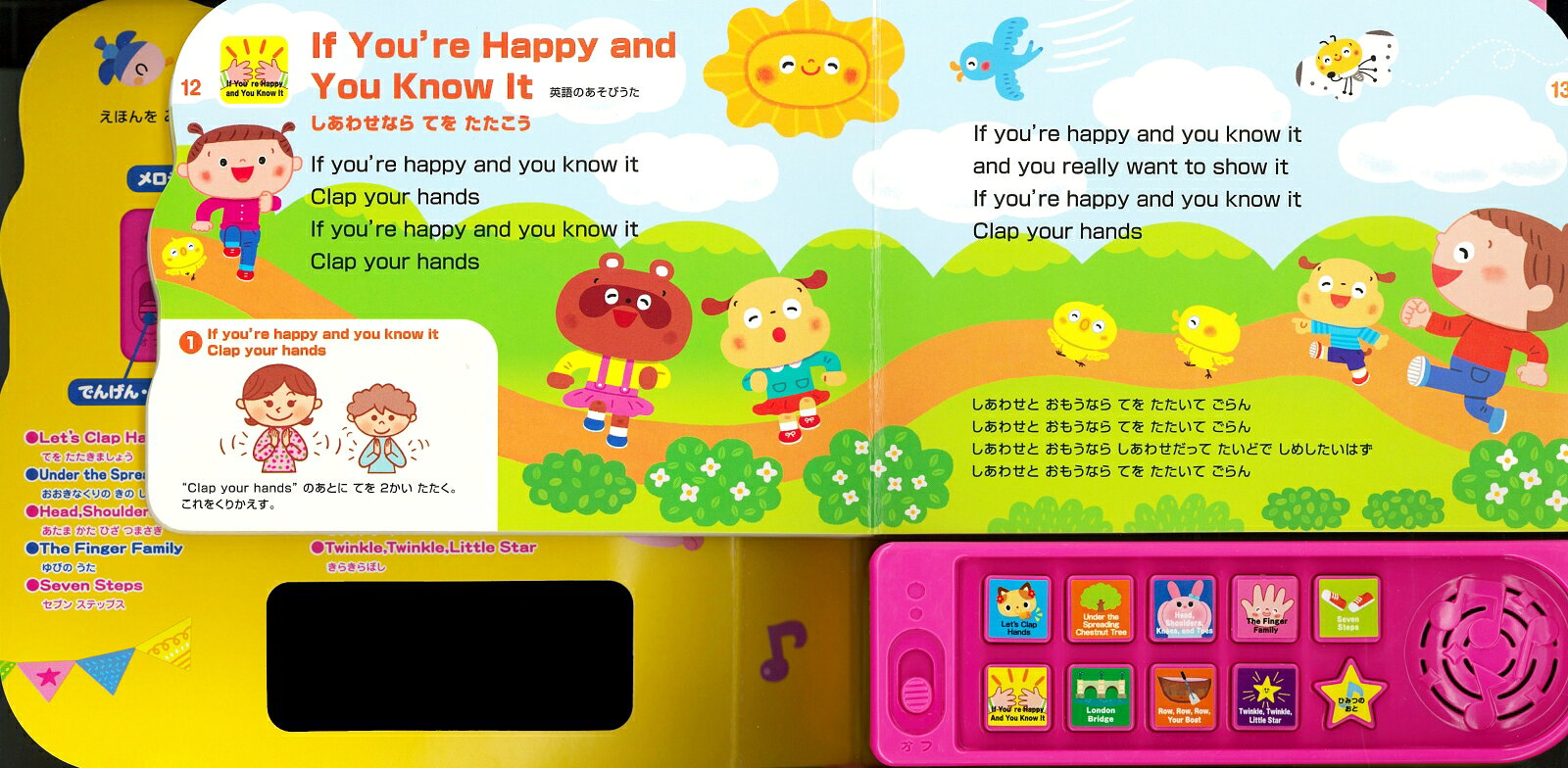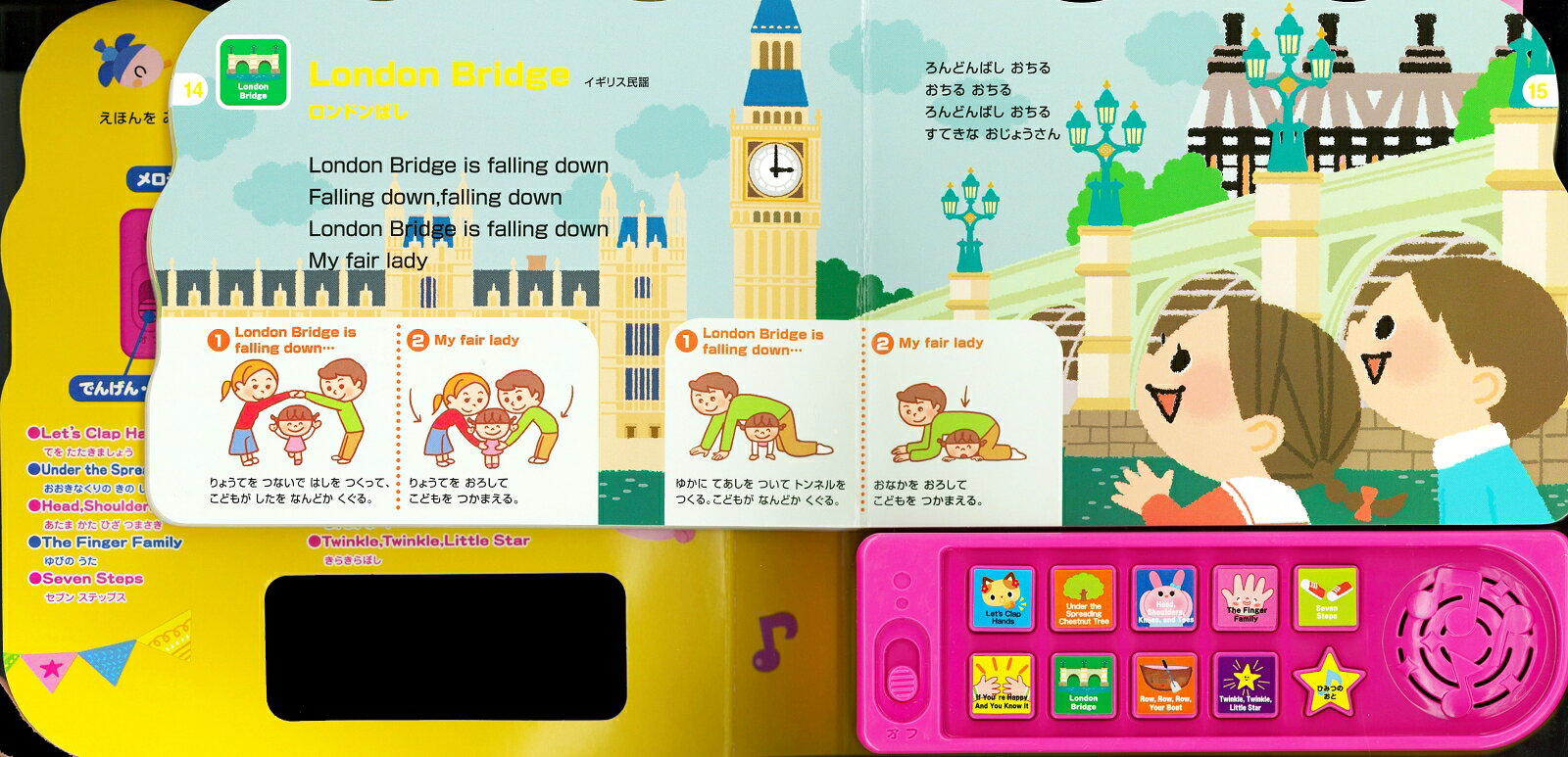 ボタンを押すと、本に付随しているスピーカーから楽しい英語のうたを聞くことができます。