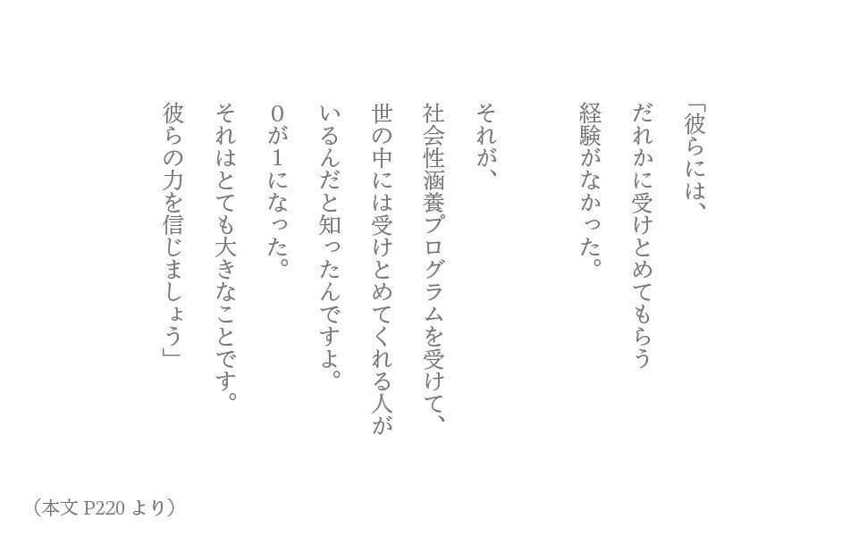 少年刑務所に収容された受刑者の中でも、特に問題を抱えた者が対象の「絵本と詩の講座」について、その講義内容と講師の心情が詳細に語られている。愛情も関心も温もりも与えられずに大人になったら、心には大きな空洞ができてしまうのは当然だと思う。自分を信じることさえ出来ないのに、人を信じられるはずもない。詩の形でわずかな言葉を絞り出すまでの一歩がものすごく遠いが、恐る恐る踏み出したその一歩で人生が劇的に変わっていく姿に深く感動した。矯正施設だけでなく、全ての教育現場でこの指導方法を共有したら、いじめも無くなるのではないかと思った。