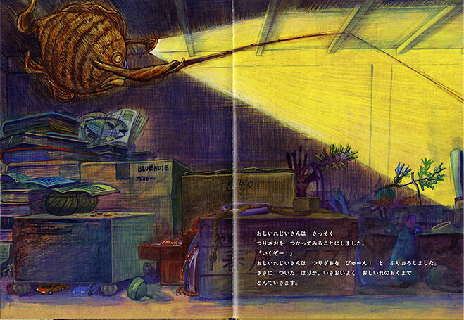 今夜は、おしいれの奥で、針と糸のついた棒を発見したおじいさん。それが「おおもの(大物)」と呼ばれる獲物を釣り上げる道具だと知って、さっそくおしいれの中で「おおもの」を仕留めにかかります。けれども、いくら竿を振りおろしても、釣れるのはハンガーだったり長靴だったり、「おおもの」とは似ても似つかないヘンなものばかり。とうとう疲れてしまったおじいさんは、「おおもの」釣りを諦めようとしますが、ちょうどそのとき、竿についていた針と糸とがダンボールの隙間に入り、何かにひっかかります。引っ張っても引っ張ってもなかなか引き上げられないその「何か」。さあ、はたしておじいさんが釣り上げたものとは......?