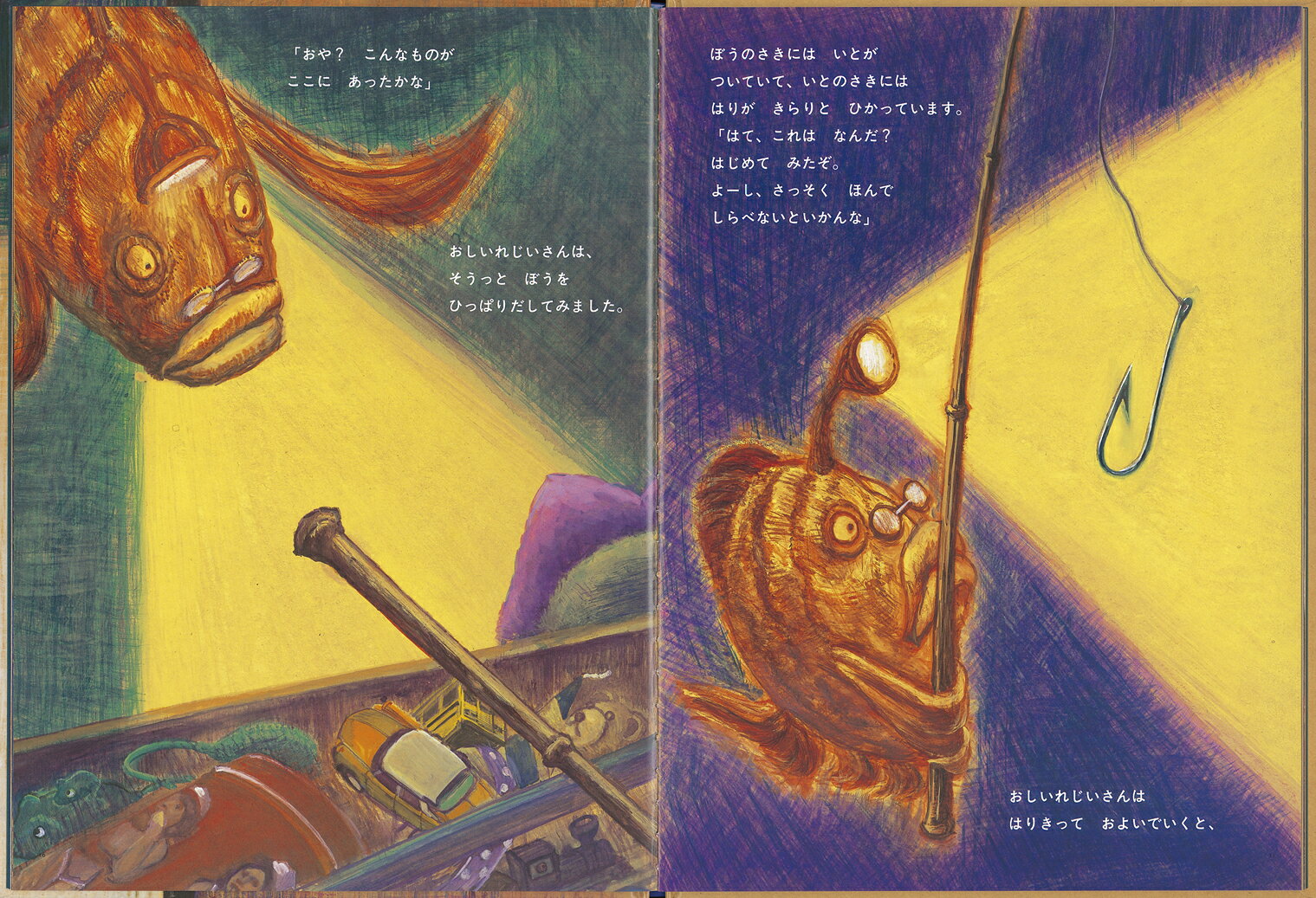 ある家のおしいれに、魚の姿をしたおしいれじいさんがこっそり住んでいます。おしいれじいさんは、人間が眠る夜になると起きだし、おしいれの中で、おでこのライトをつけて遊びはじめます。おしいれの中にある使われなくなった道具やおもちゃは、じいさんのお気に入りの遊び道具です。人間が起きてくる朝まで、今晩はなにをして遊ぶのでしょう? 日常の延長線上にあるふしぎな世界を描いた作品です。