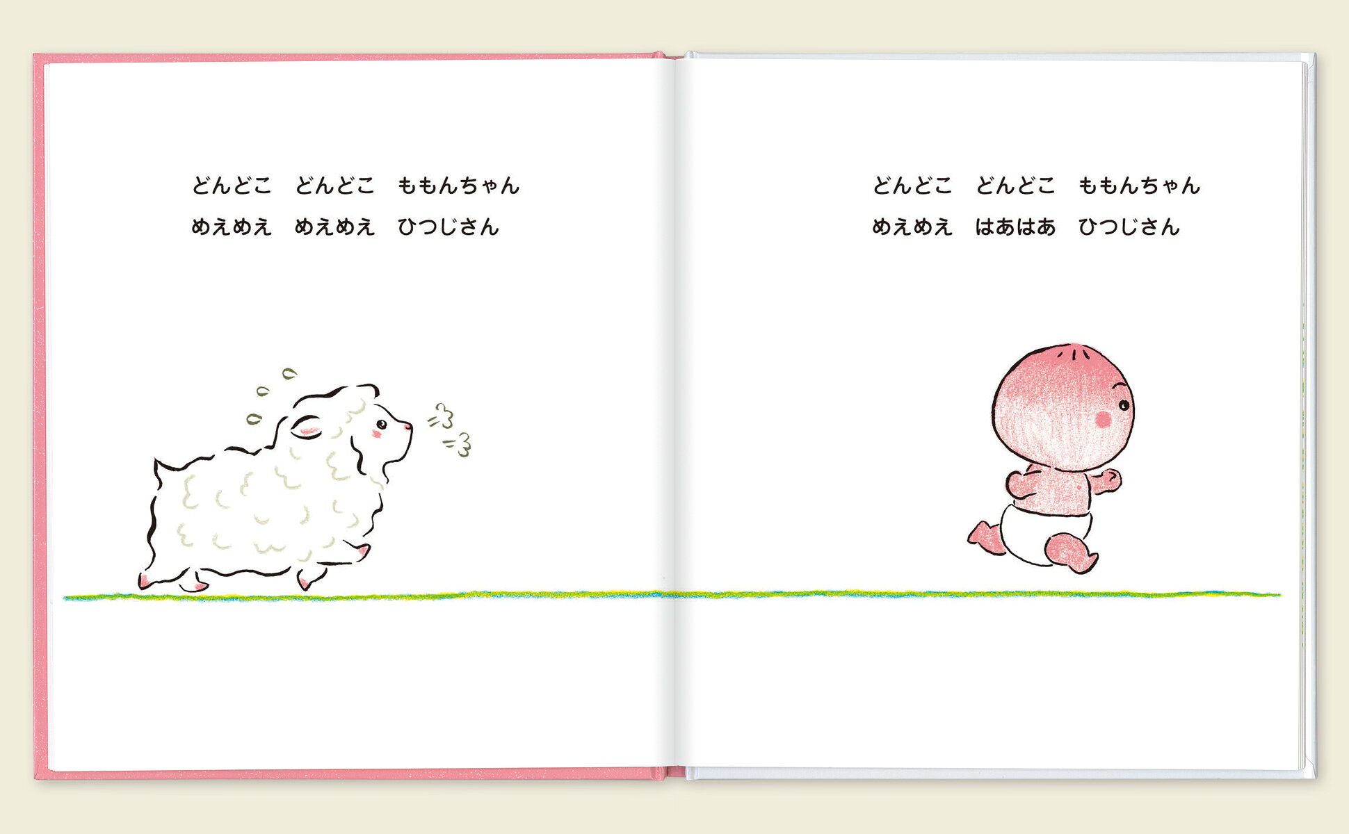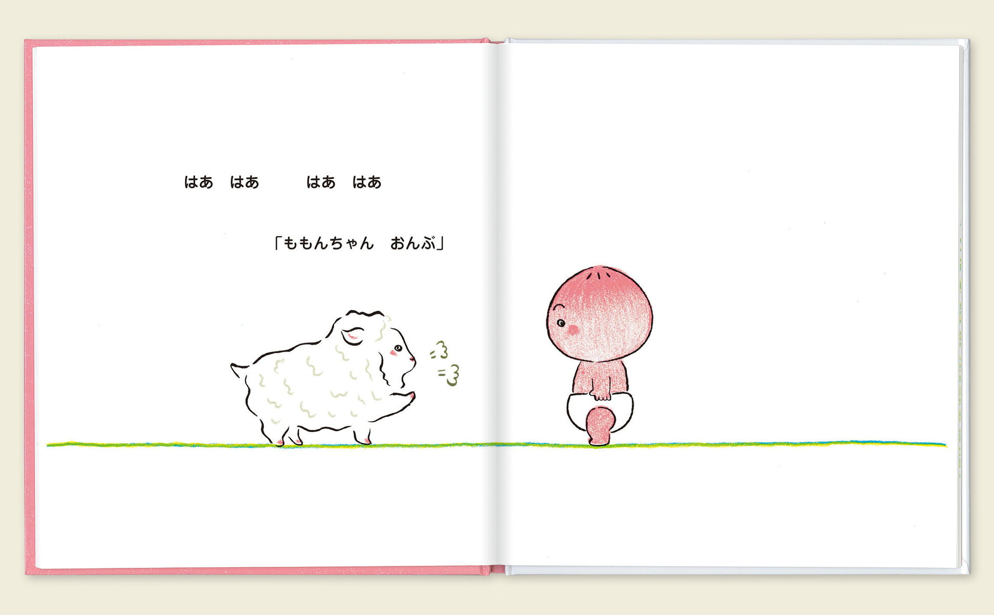 どんどこ、めえめえ、一緒に走っていたら、ひつじさんがつかれちゃったみたい。「ももんちゃん おんぶ」だって。おんぶおんぶのひつじさん、らくちんらくちんひつじさん……。ももんちゃんがひつじさんをおんぶして走っていると、きんぎょさんやさぼてんさんも「おんぶー」だって!? ちくちくのさぼてんさんのこと、ももんちゃん、おんぶできるかな? 最後はももんちゃんもお母さんにおんぶしてもらって、しあわせそう!