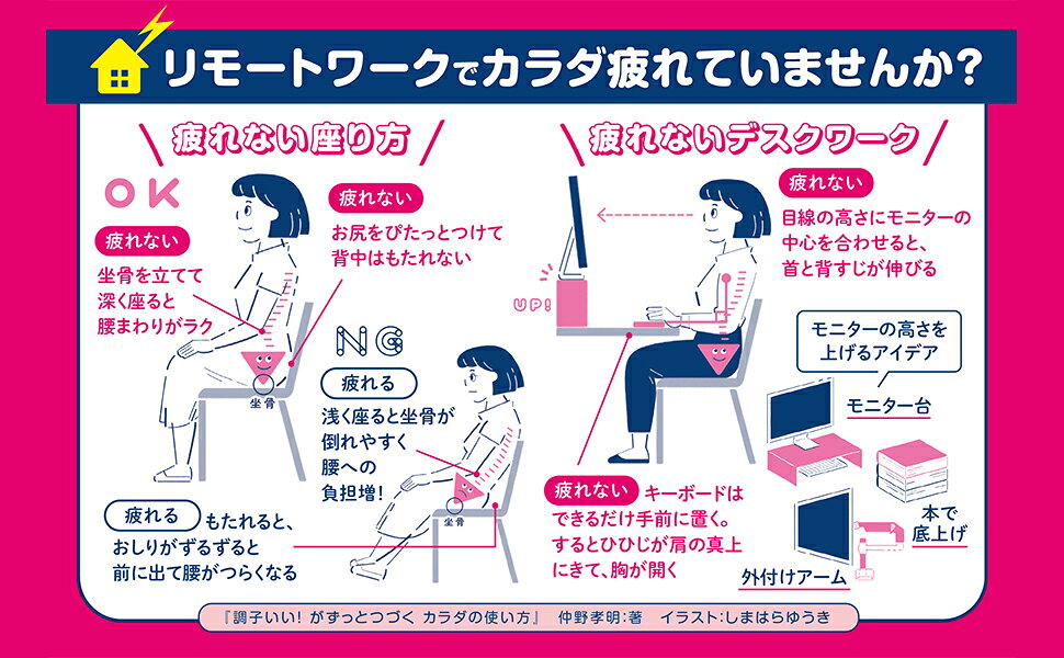 座り方や、PCのモニターの高さを変えるだけで疲れが変わります!