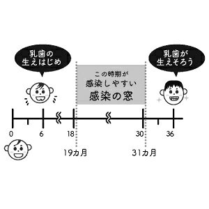 むし歯菌の母子感染には起こりやすい時期というものがあります。「感染の窓」と言われている、1歳半から2歳半までの乳歯が次々と生えてくる1年間です。
