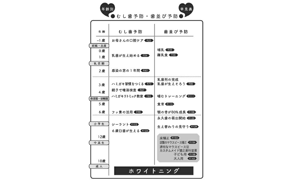 1 -1歳から1歳 妊娠から出産 「歯育て」は、お子さんに歯が生える前から/2 1歳から3歳 むし歯になるか、ならないかは、3歳までの過ごし方が大切/3 3歳から6歳 顎の骨が8割成長する6歳までに、お母さんがわが子にできること/4 6歳から12歳 永久歯に生え替わるこの時期に、知っておきたい歯科治療/5 12歳から18歳 歯育ての仕上げに美しく整える 正しい矯正で自信をつくる/6 18歳から 初対面の印象は、歯の美しさで決まる 18歳からの審美歯科