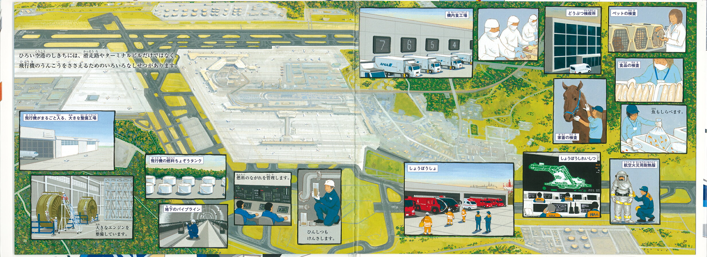 空港に朝はやく飛行機がやってきました。そして、電車やバス、自家用車などに乗って、お客さんや、空港ではたらく人が次々にやってくると、空港はまるで目を覚ますように動きだし、にぎやかになっていきます。にぎやかなのは人だけではありません。空港には、荷物もたくさんやってきて、世界中に運ばれていきます。夜になると、次は翌朝の飛行機を迎えるための準備を、休むまもなくすすめます。この本では、そんな空港のいちにちを描きます。