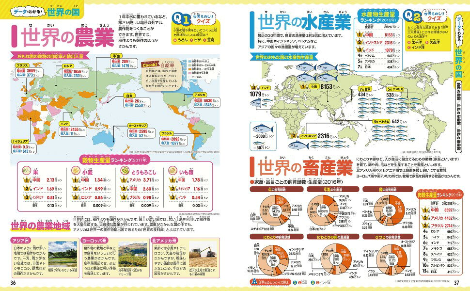 ・「データでわかる! 世界の国」では、「地形」「気候」「貿易」「農業」など、地理学習に必要なテーマを図版やイラストでわかりやすく解説。
