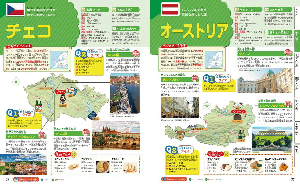 ・世界の国の代表的な見どころ、特産品、グルメを写真やかわいらしいイラストで紹介。
