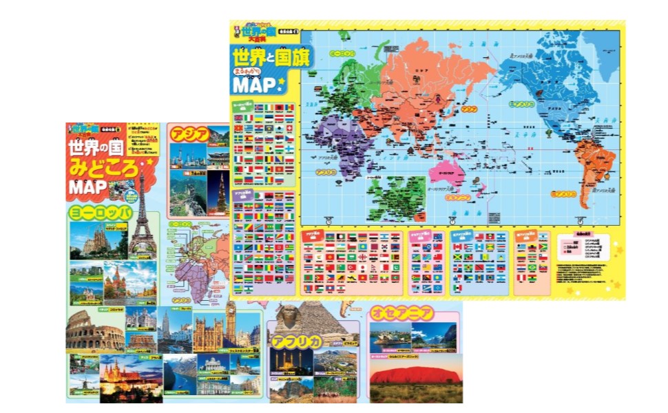 ・「世界と国旗 まるわかりMAP」:正縮尺の世界地図、さらにすべての国の国旗を掲載。