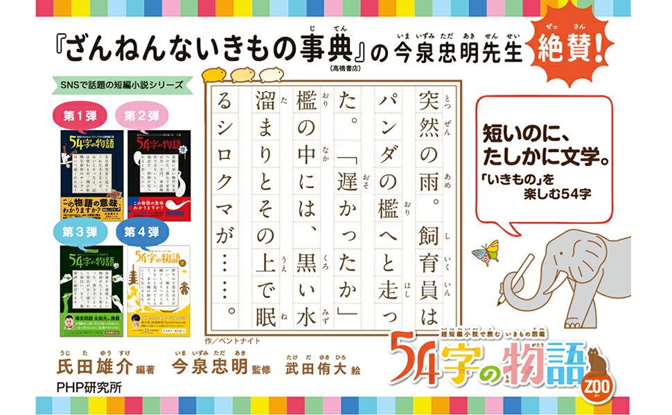 累計25万部突破の「54字の物語」シリーズ最新刊は、イヌ、ネコ、パンダから、恐竜、ツチノコまでズーーーっと楽しめる90話を収録。