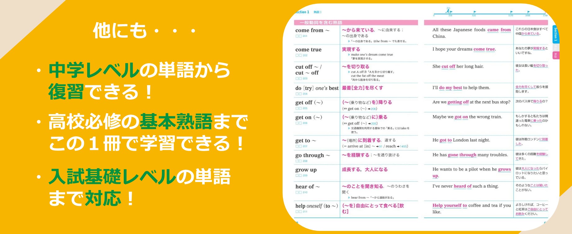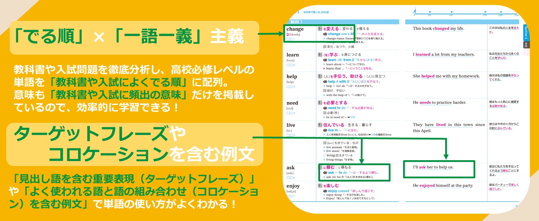 1 中学校で習った200語/2 基礎を固める300語/3 テーマで身に付ける500語/4 語法で覚える200語/5 入試によく出る200語/巻末特集
