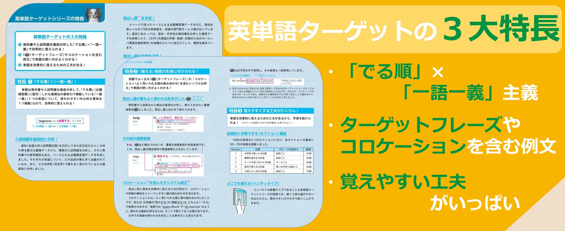 『英単語ターゲット1400』、『 〃 1900』につながる高校必修レベルの単語集。中学既習の200単語、高校必修の1200単語、重要な300熟語の計1700見出し語を収録。例文は見出し語を覚えるのに最適なコロケーションを含むオリジナル英文。見出し語・語義・例文(英文のみ)の音声が聞ける無料ダウンロード・ストリーミングサービス付き(公式アプリ「ターゲットの友」*での音声再生も可能)。