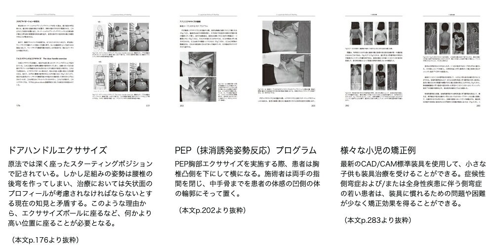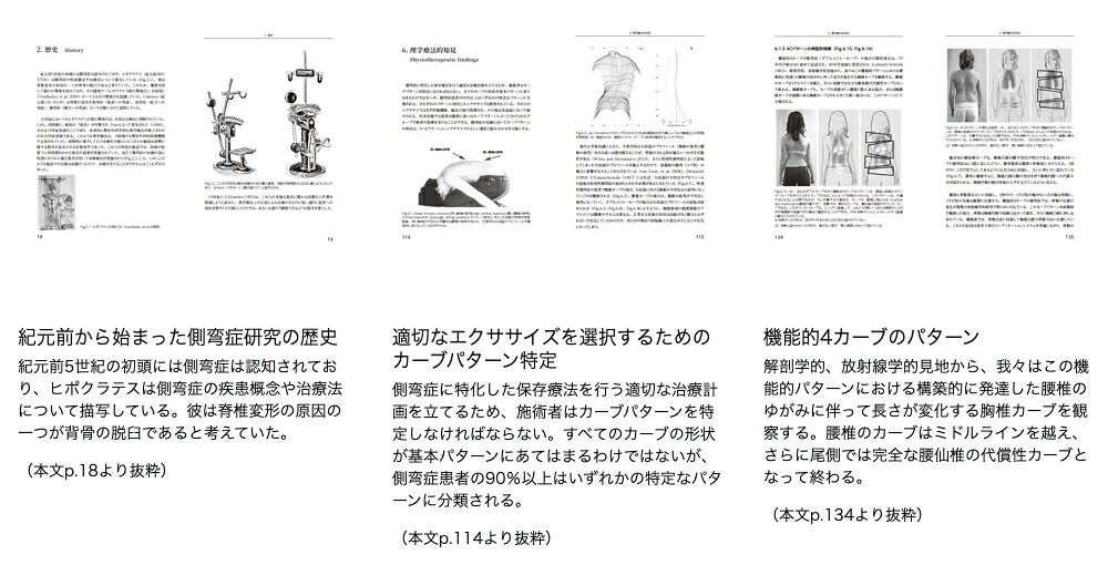 シュロスファミリーの3代目であるDr. ハンス・ルドルフ・ワイスはこの運動療法を、より効果的に、かつシンプルなプログラム、Schroth Best Practice® (シュロスベストプラクティス®)へと進化させた。本書はそのシュロスベストプラクティス®の原理と運動療法の取り組み方を具体的に、詳細に示している。