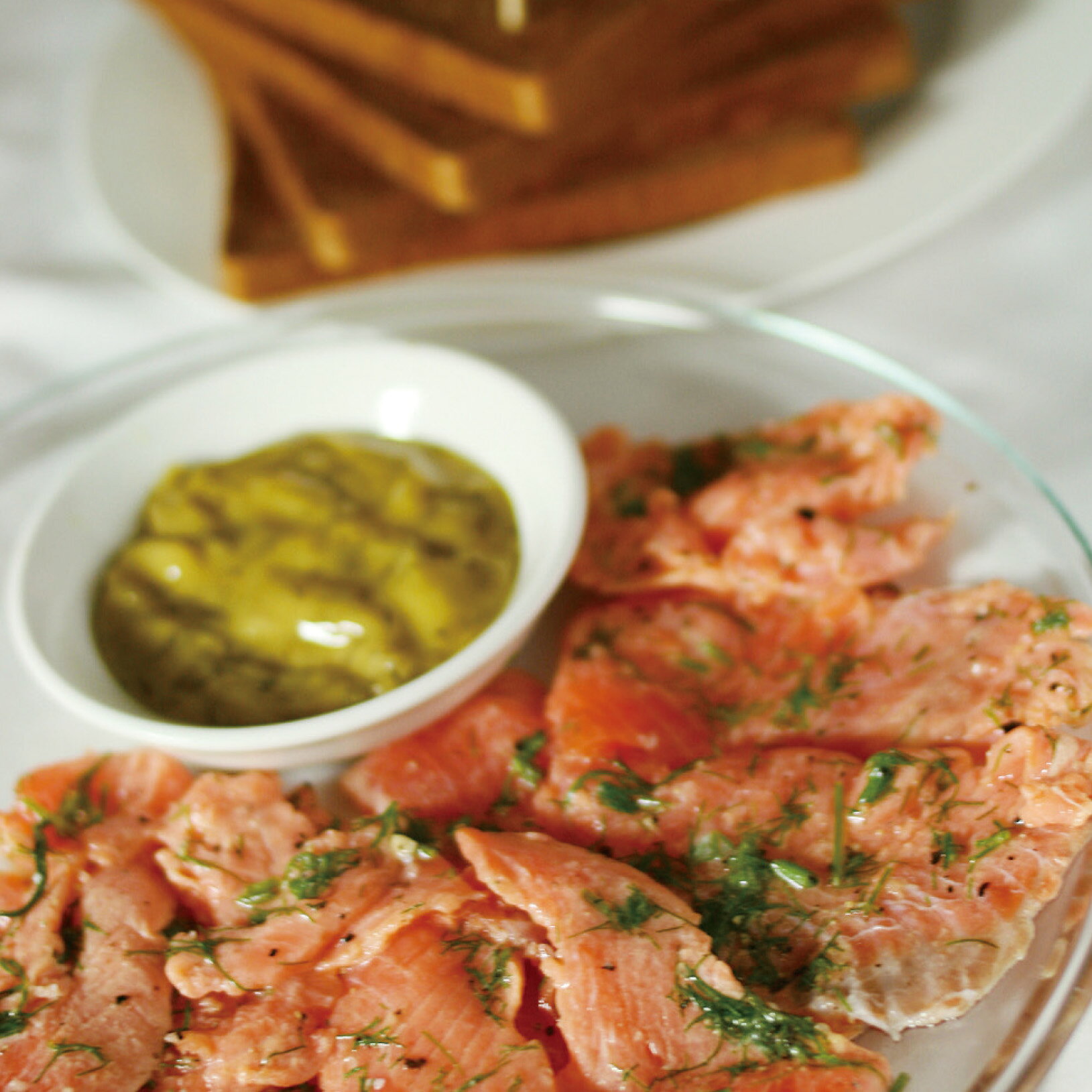 フィヨルドの美しい山がちな地形を持つノルウェーの特産品サーモンを使った、シンプルなマリネ。中世の頃からあったとされる歴史の古い料理です。寄生虫の心配がない生食できるアトランティック・サーモン(タイセイヨウサケ)を使い、ハニーマスタードやライ麦の黒パンと一緒に食べます。