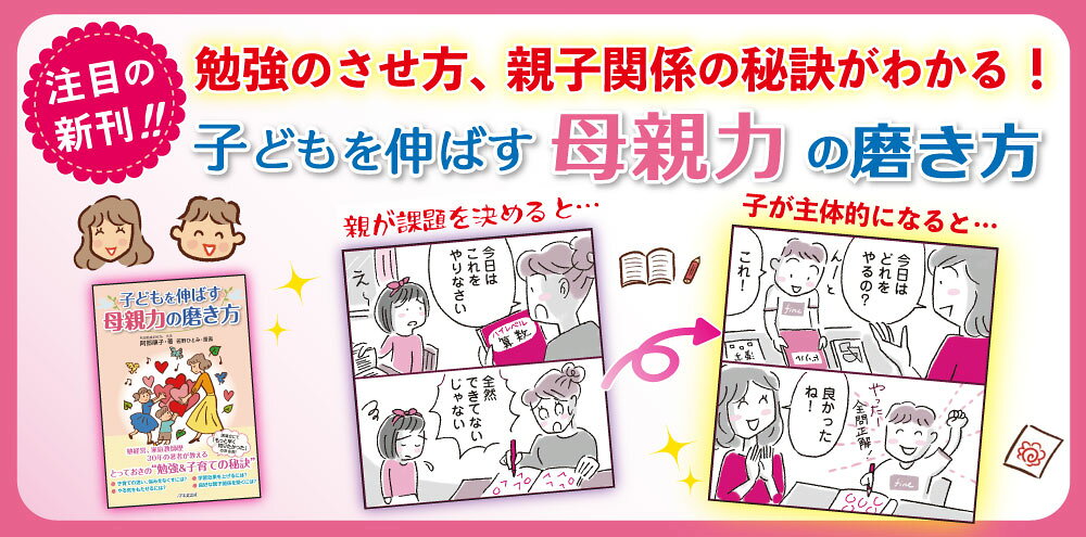 「ストレスフリーな子育て」をモットーに、丁寧で分かりやすい解説と漫画で、自然と勉強が好きになる導き方や、心に余裕を持つ母親になるためのコツを伝授します。