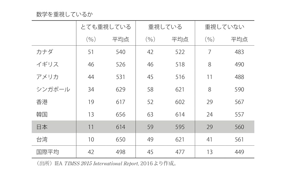 表2─2は、2015年度のTIMSS(国際数学・理科教育動向調査)で発表されたものである(4年生と8年生に関して発表されているが、ここでは中学2年に相当する8年生で作成)