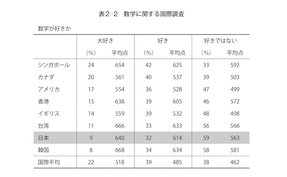 たとえば「数学が好きか」で「大好き」と答えた生徒の割合が日本は9%で、その人たちの数学試験の平均点は640点ということである。