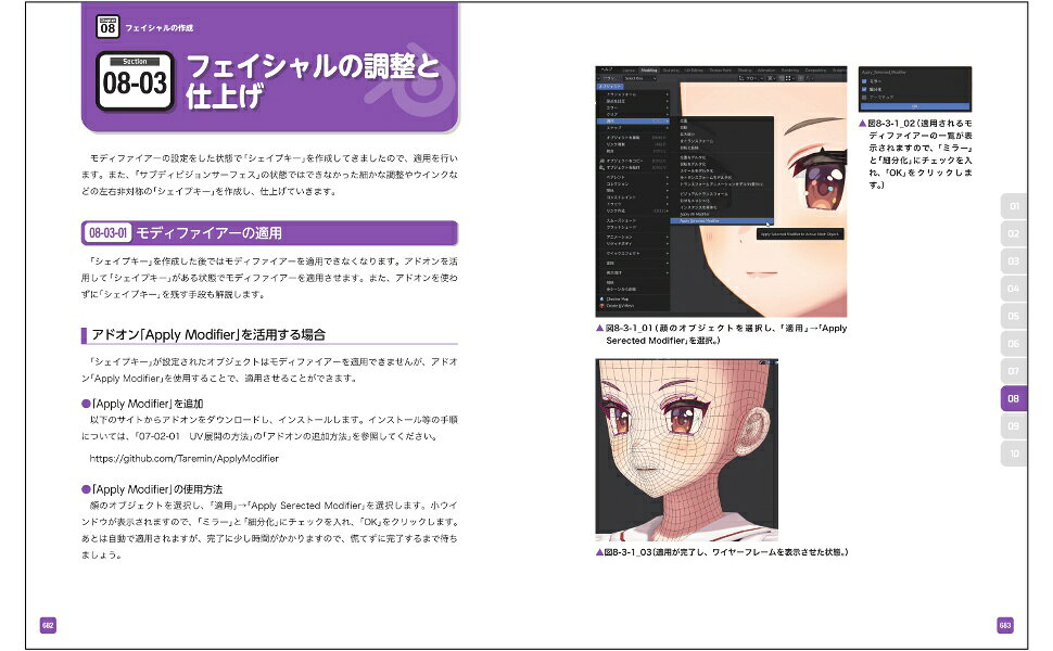 01 モデリングの準備/02 顔のモデリング/03 素体のモデリング/04 素体のスキニング/05 Unityでの素体の動作テスト/06 衣装のモデリング/07 マテリアルの設定とテクスチャの作成/08 フェイシャルの作成/09 Unityでのセットアップ/10 VRChatのセットアップ