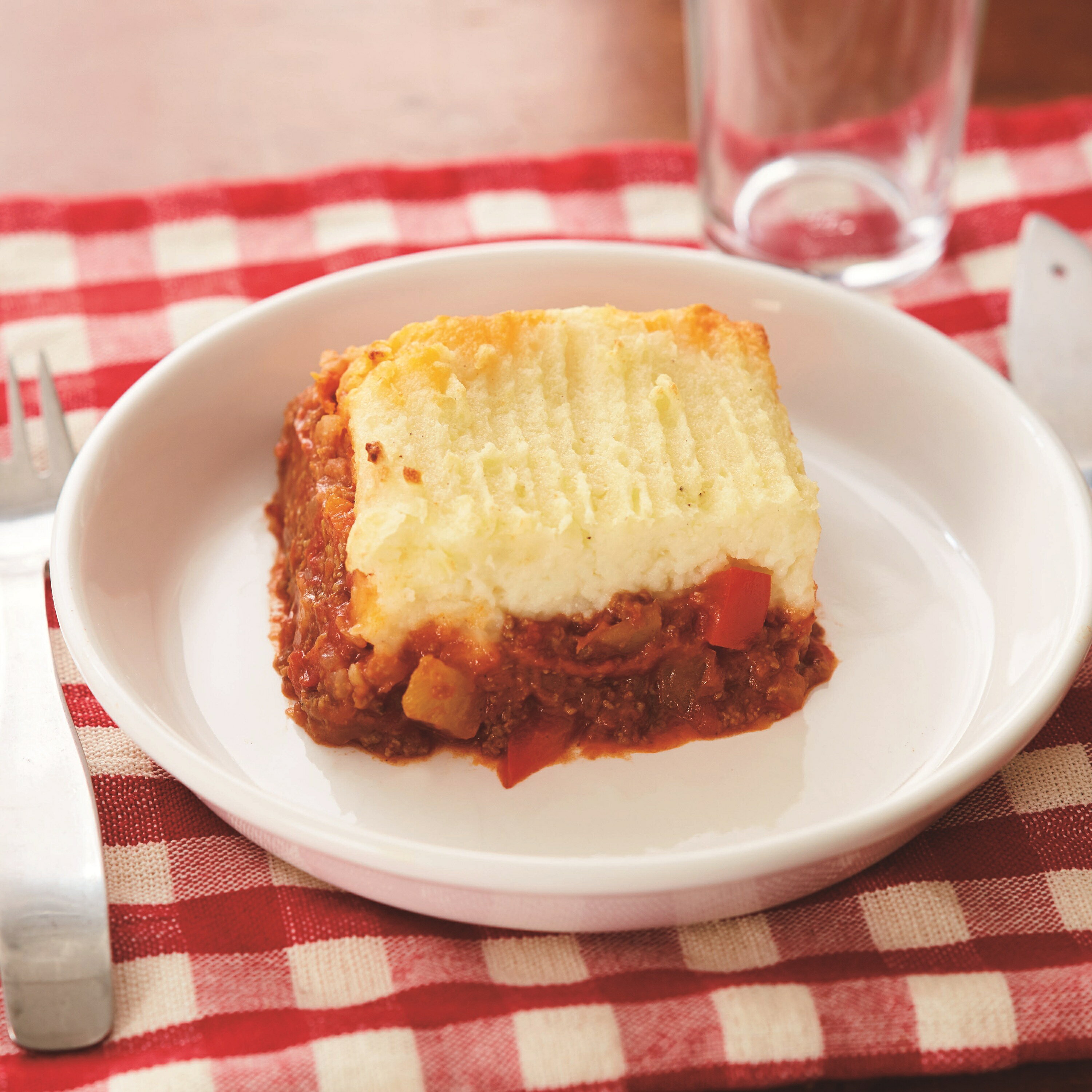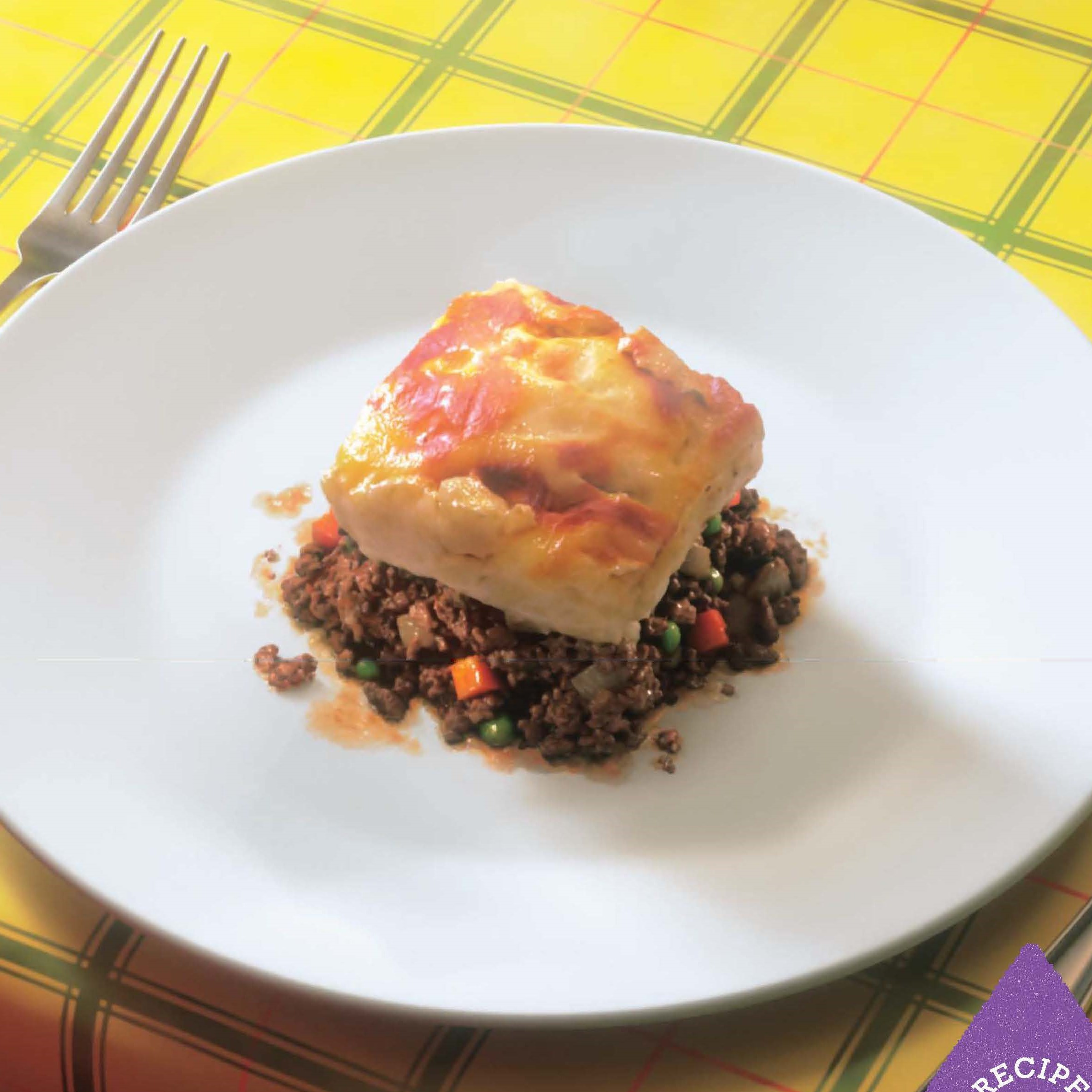 牛ひき肉、玉ねぎ、パプリカのはいったミートソースにマッシュポテトをのせて、グラタンのようにやいたら完成。